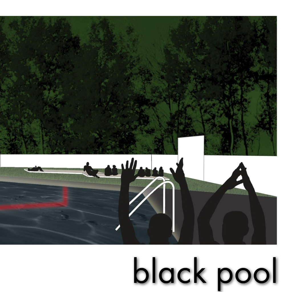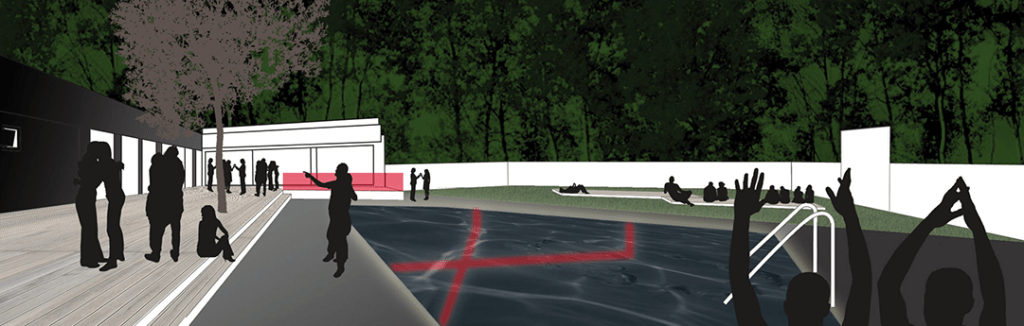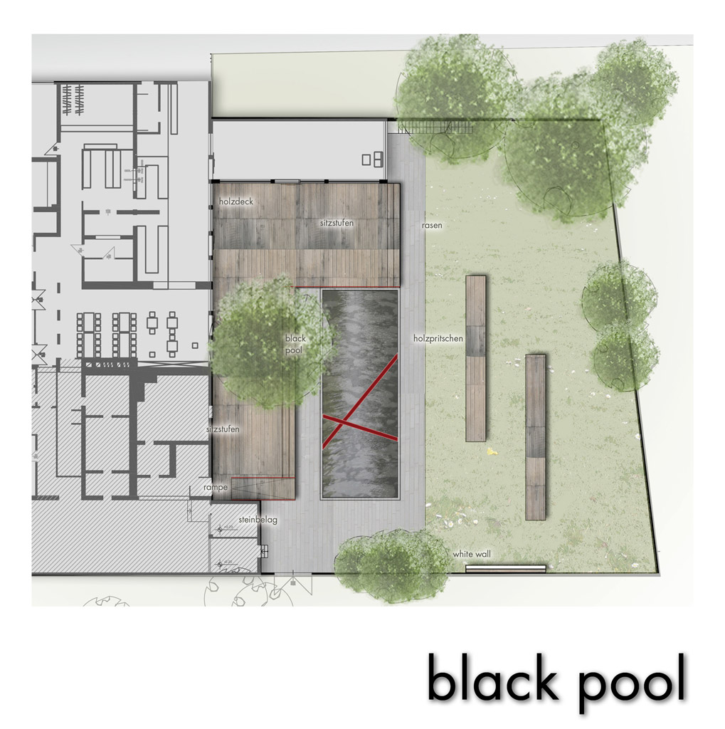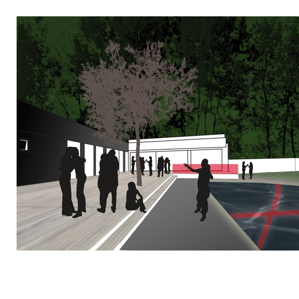Aufgabe: Entwicklung eines Konzeptes für das Festival Poolbar mit Pratersauna. Das Konzept für die Gartengestaltung setzt einen Kontrastpunkt zum stilistischen Potpourri der Pratersauna. Drei Farben: rot, schwarz, weiß. Drei Bodenmaterialien: Holz, Stein, Rasen.