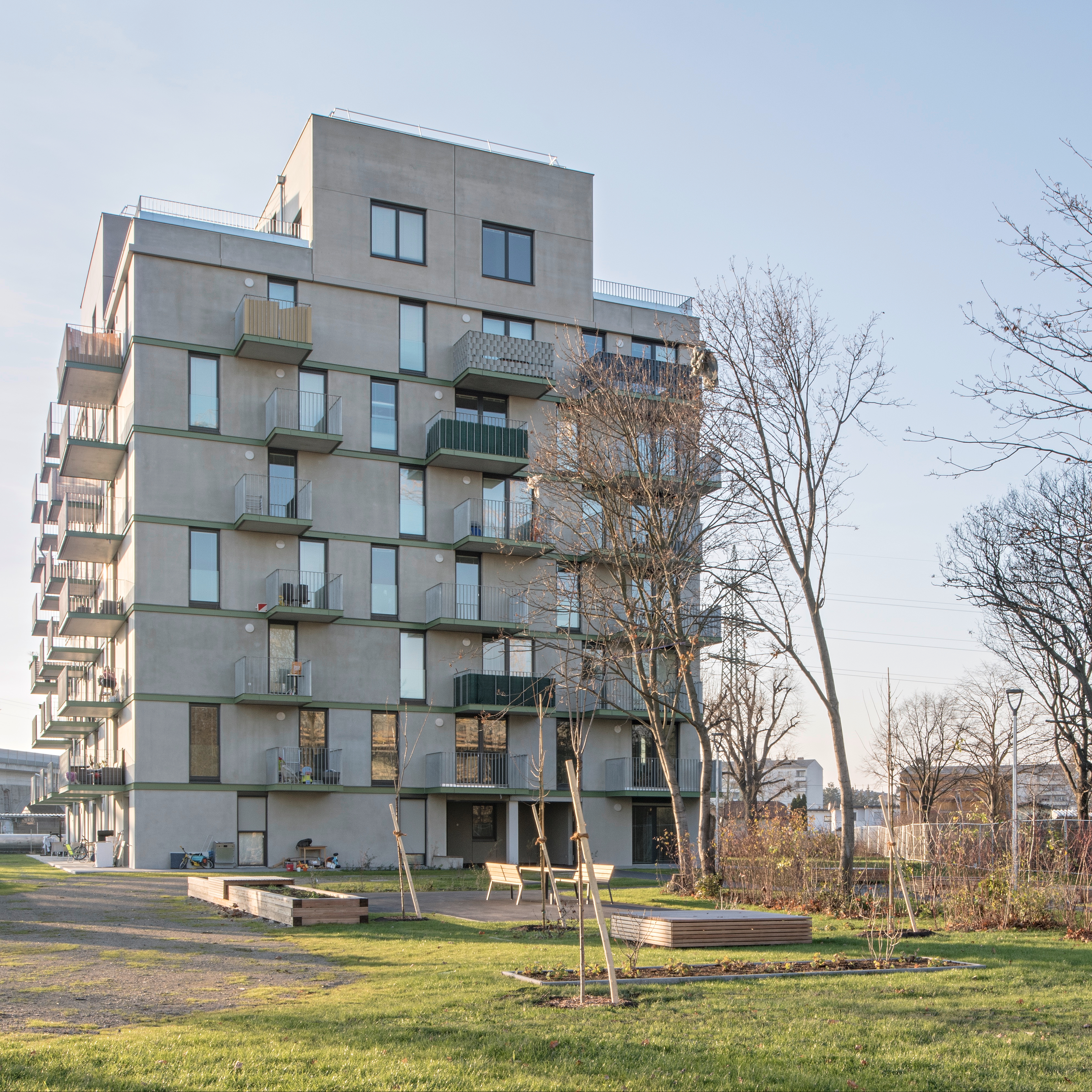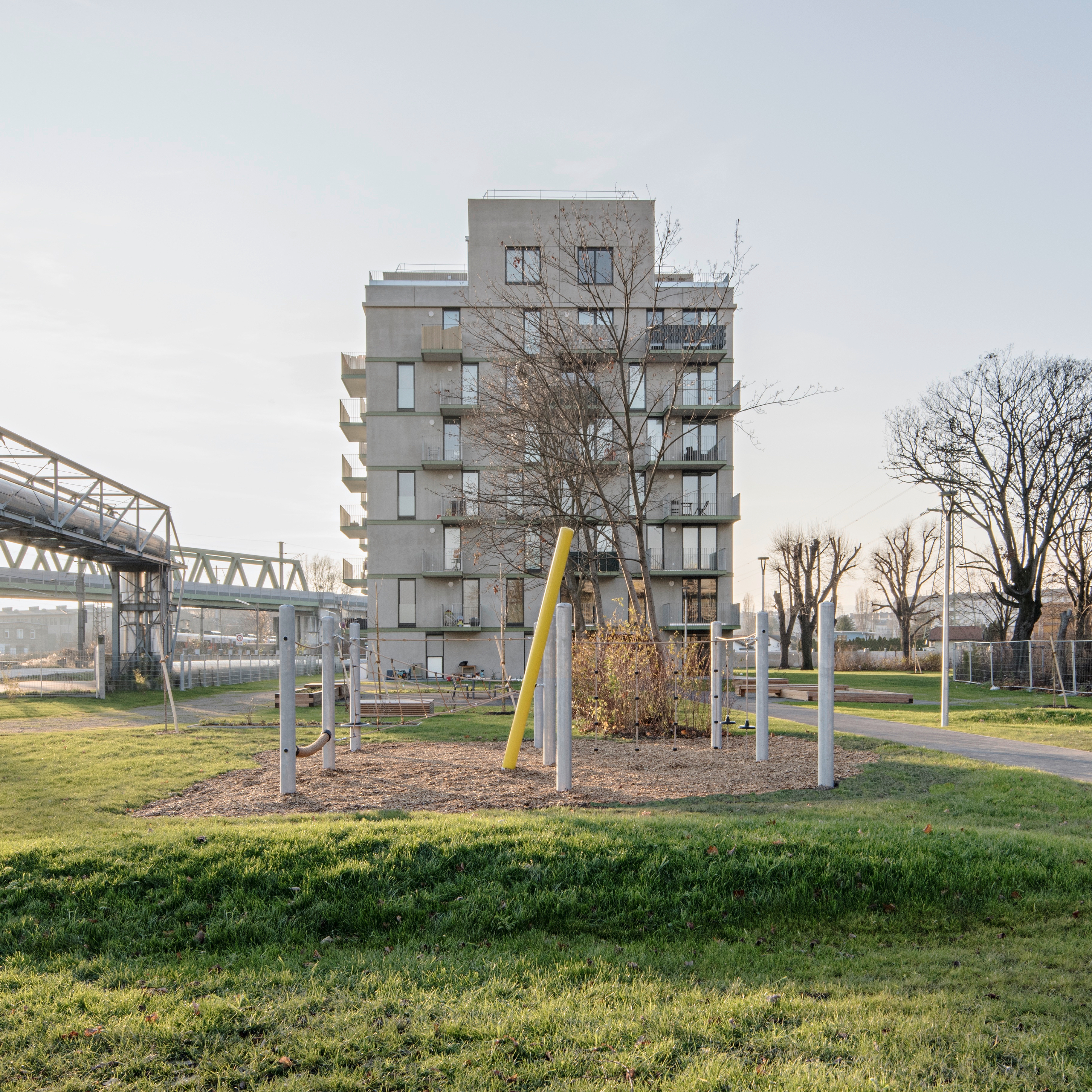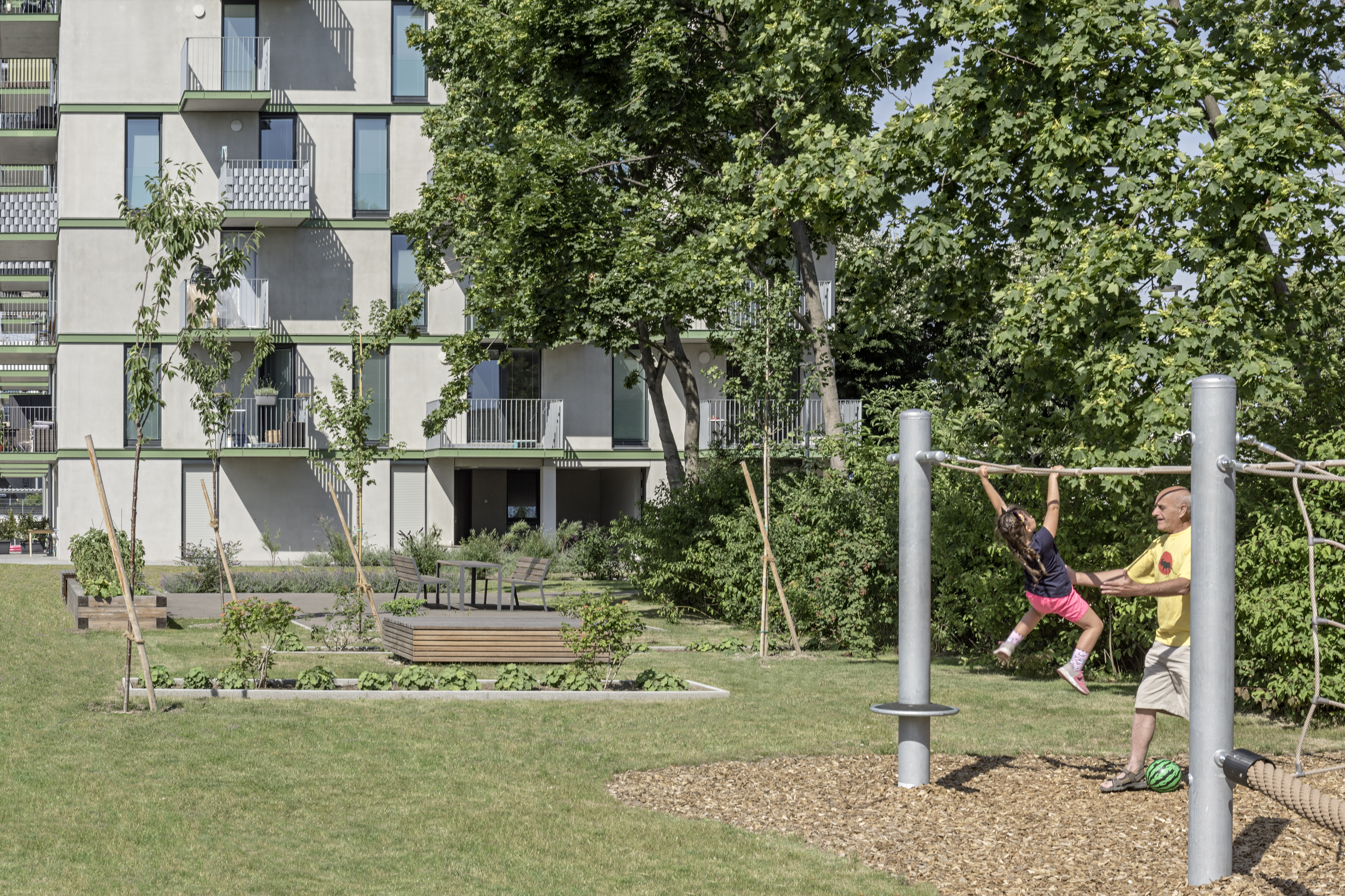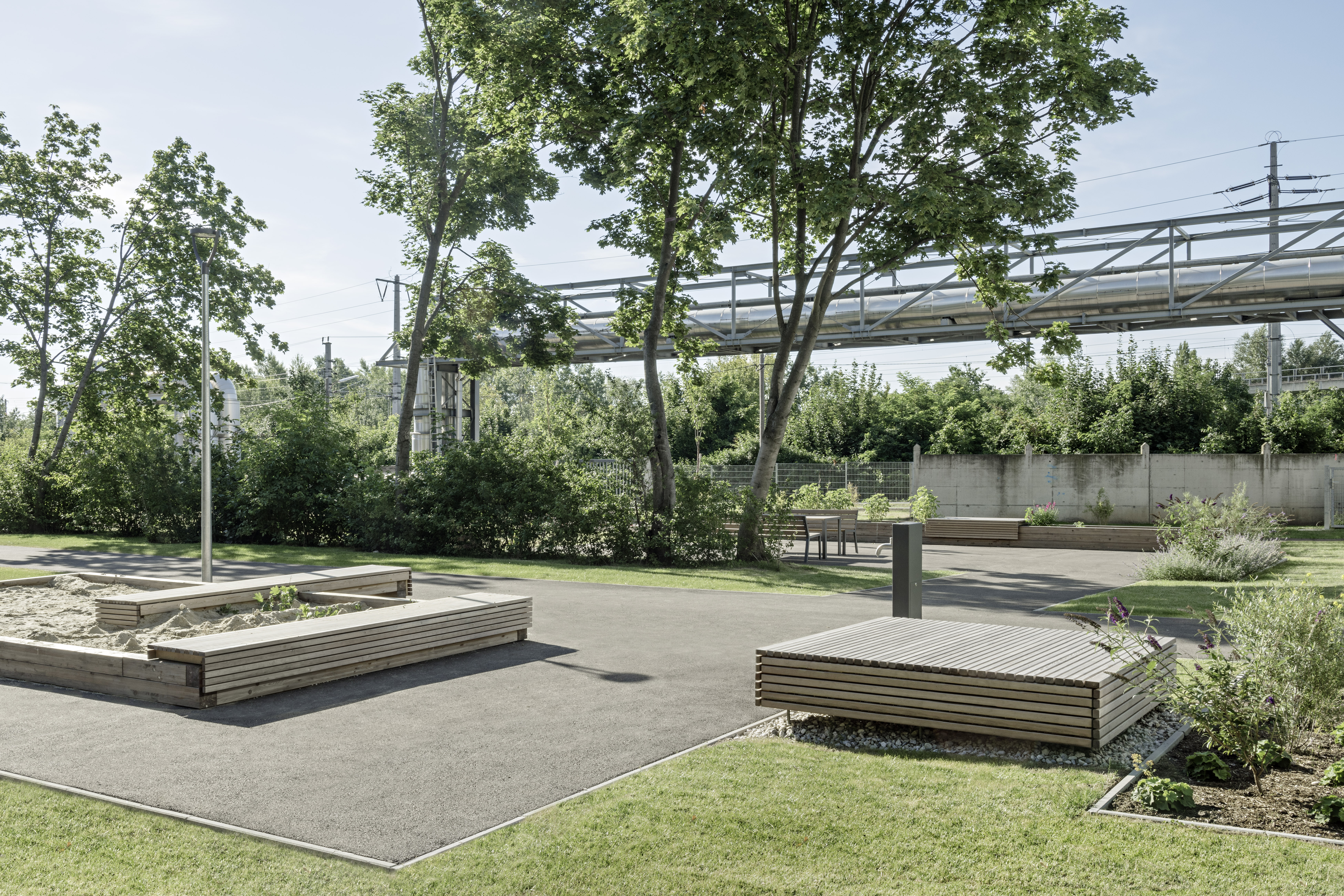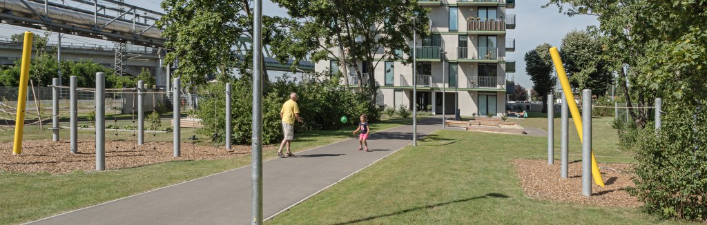 Aufgabe: Gebäude und Freiraum vermitteln zwischen historischem Bestand und dem neuen Stadtteil Neu Leopoldau. Für die Vor-Millennials-Generation „X, Y, Z“ werden die Freiflächen zugeschnitten. Es gibt eine Gemeinschaftsterrasse mit Pflanzbeet und einen Stangenwald für alternatives Spiel, eingebettet in den wertvollen Baumbestand.