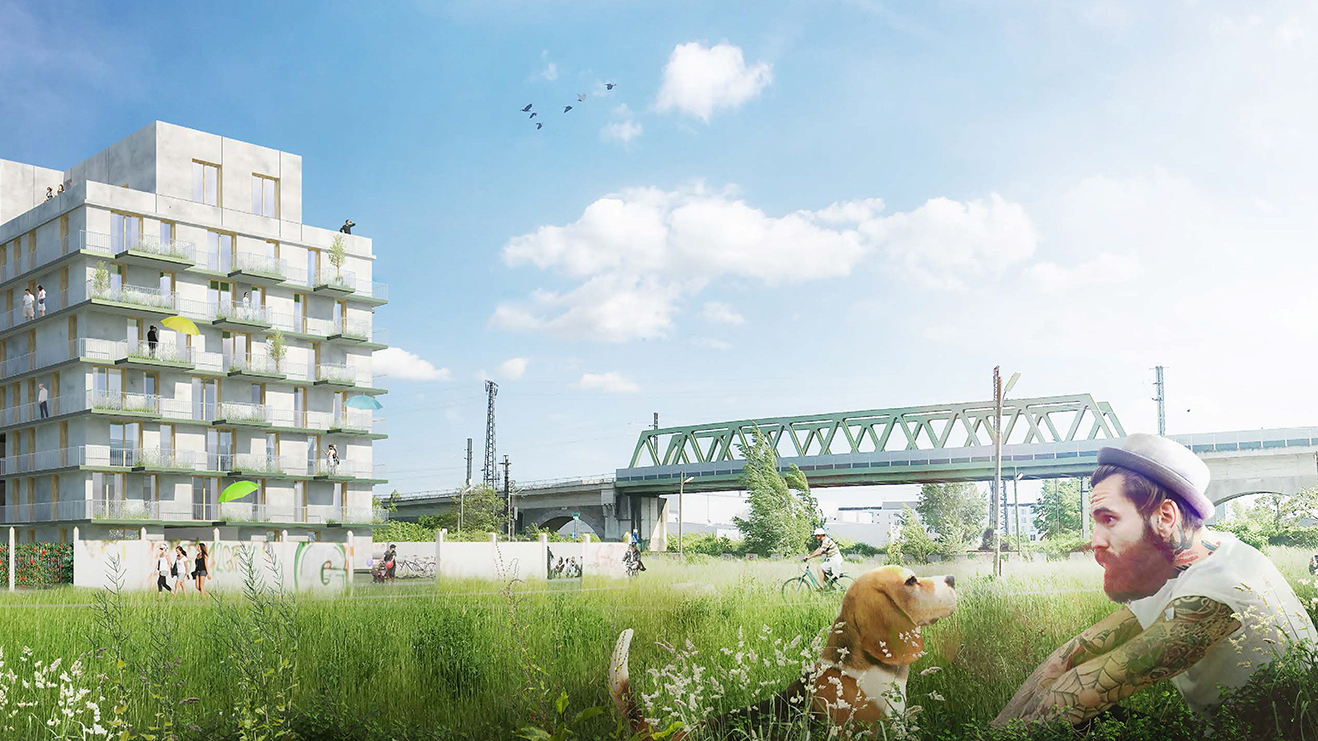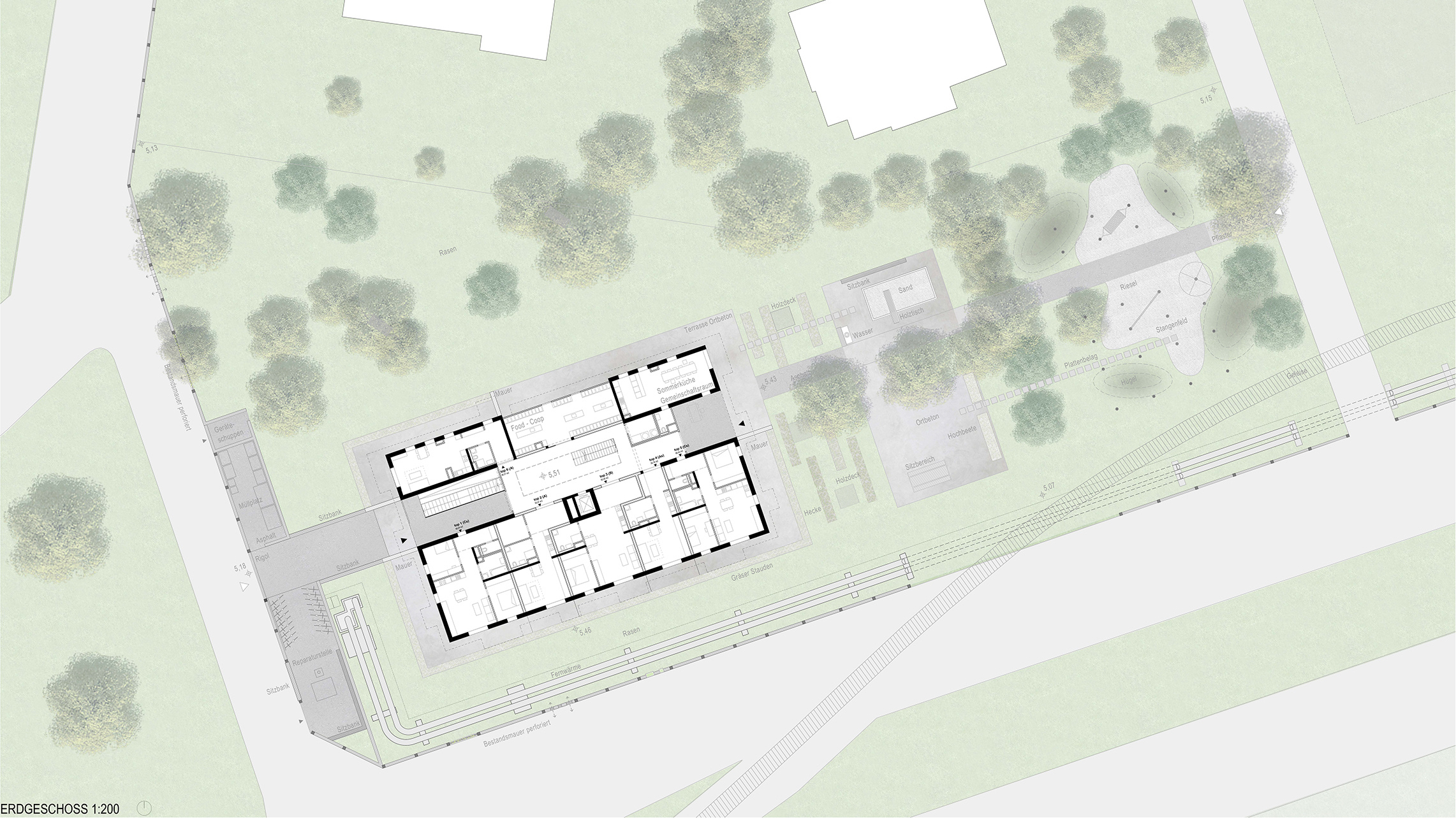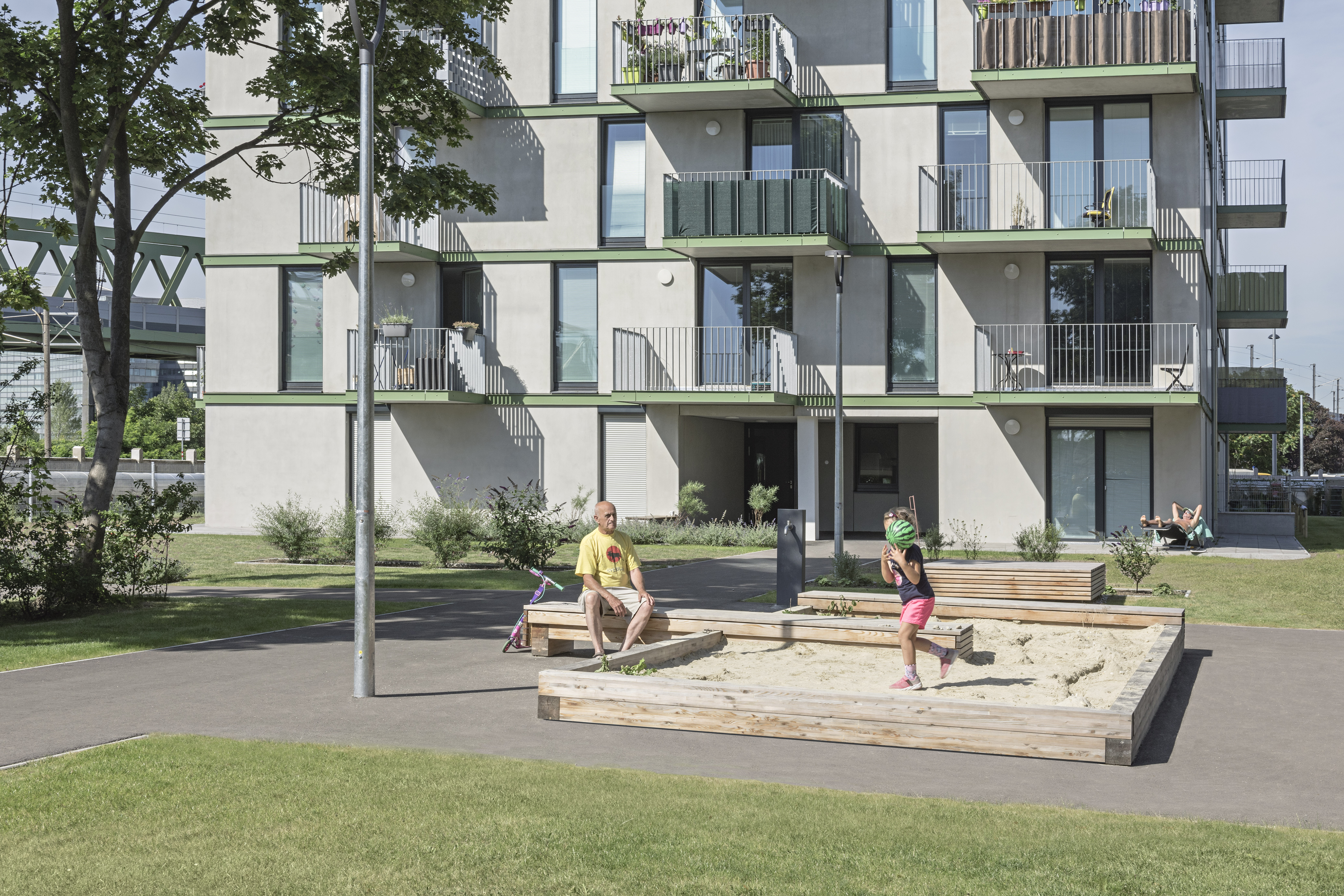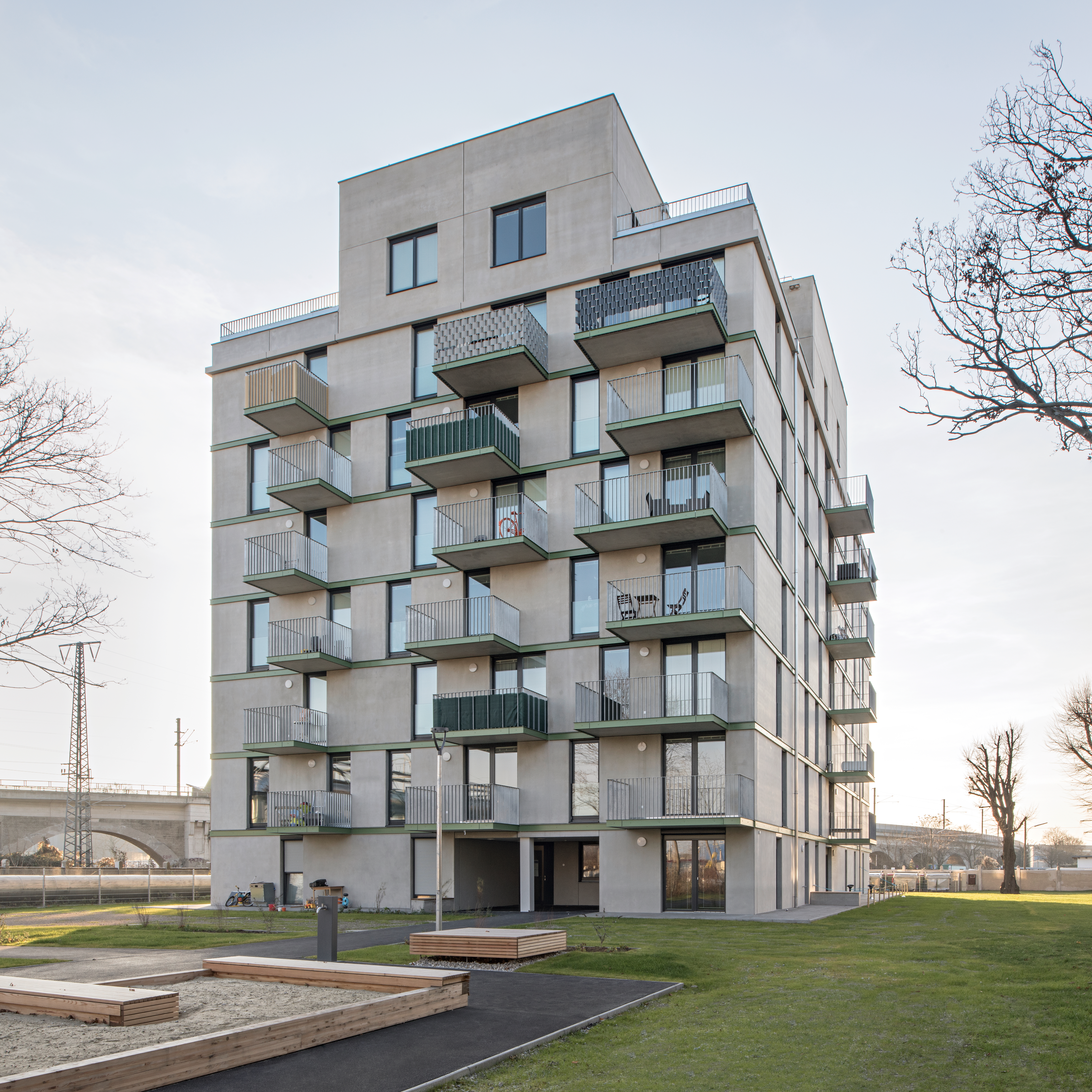 Aufgabe: Gebäude und Freiraum vermitteln zwischen historischem Bestand und dem neuen Stadtteil Neu Leopoldau. Für die Vor-Millennials-Generation „X, Y, Z“ werden die Freiflächen zugeschnitten. Es gibt eine Gemeinschaftsterrasse mit Pflanzbeet und einen Stangenwald für alternatives Spiel, eingebettet in den wertvollen Baumbestand.