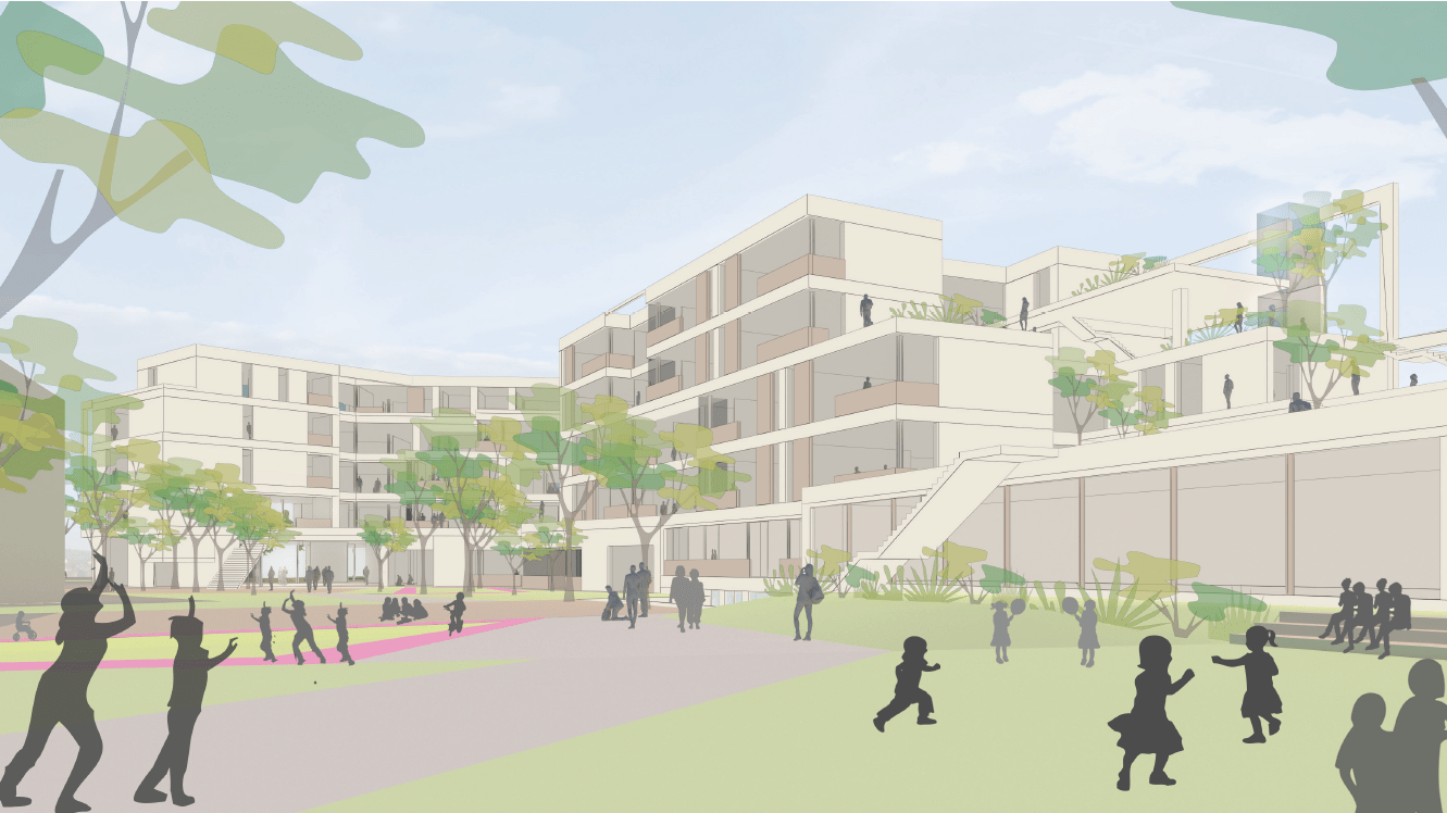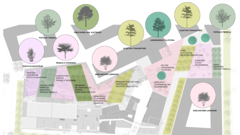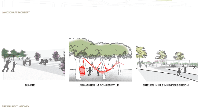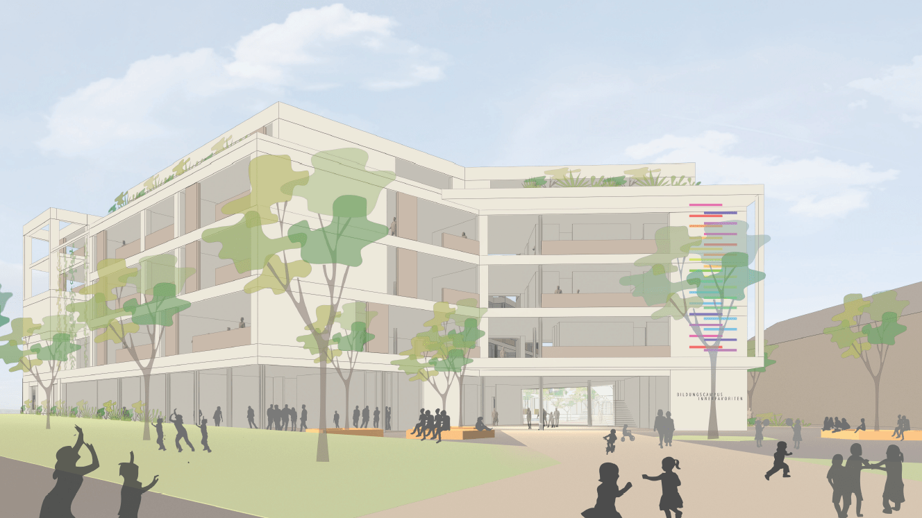 Aufgabe: Die Achse zur Favoritenstraße mit dem Haupteingang zum Bildungscampus wird als wesentlicher städtebaulicher Anknüpfungspunkt verstanden und mit breiten Bändern aus Baumhainen betont. Die Außenanlagen im Norden sind als über 4.800m² große Exklusivzone konzipiert. Alle Terrasse haben Bepflanzungsinseln, um den Kindern und Jugendlichen ansprechende Orte anzubieten.