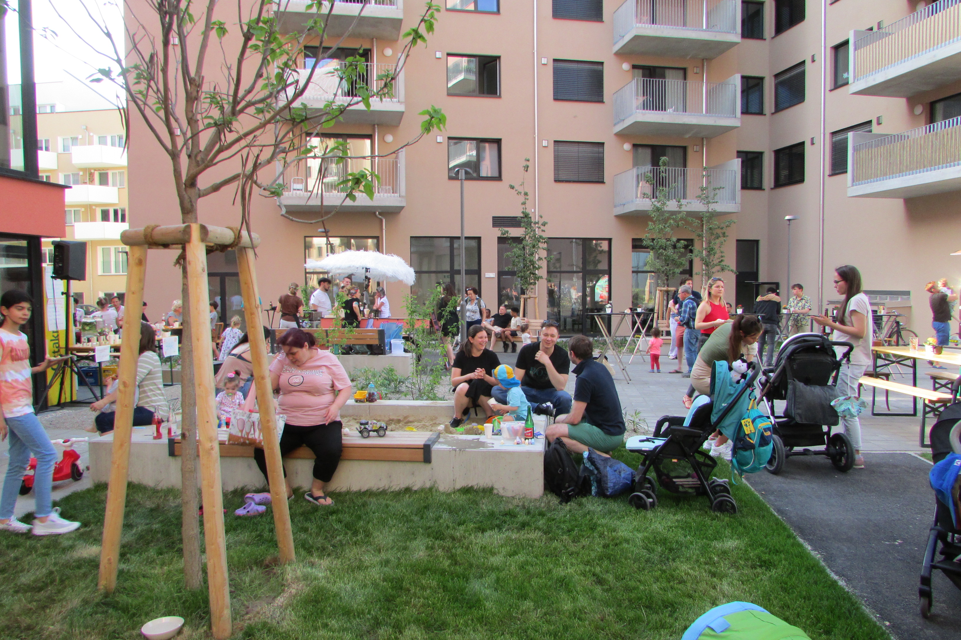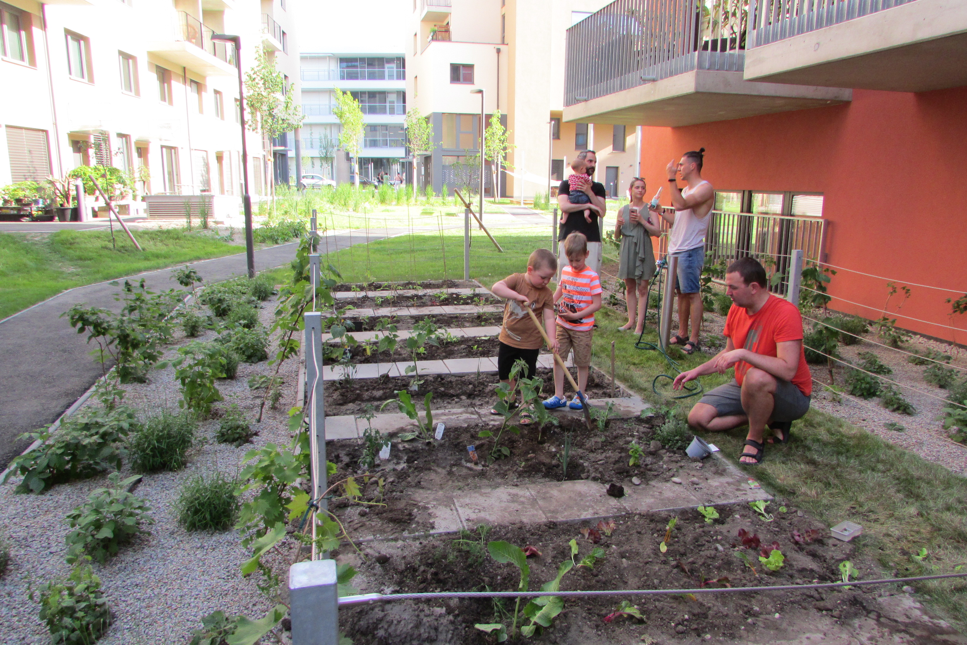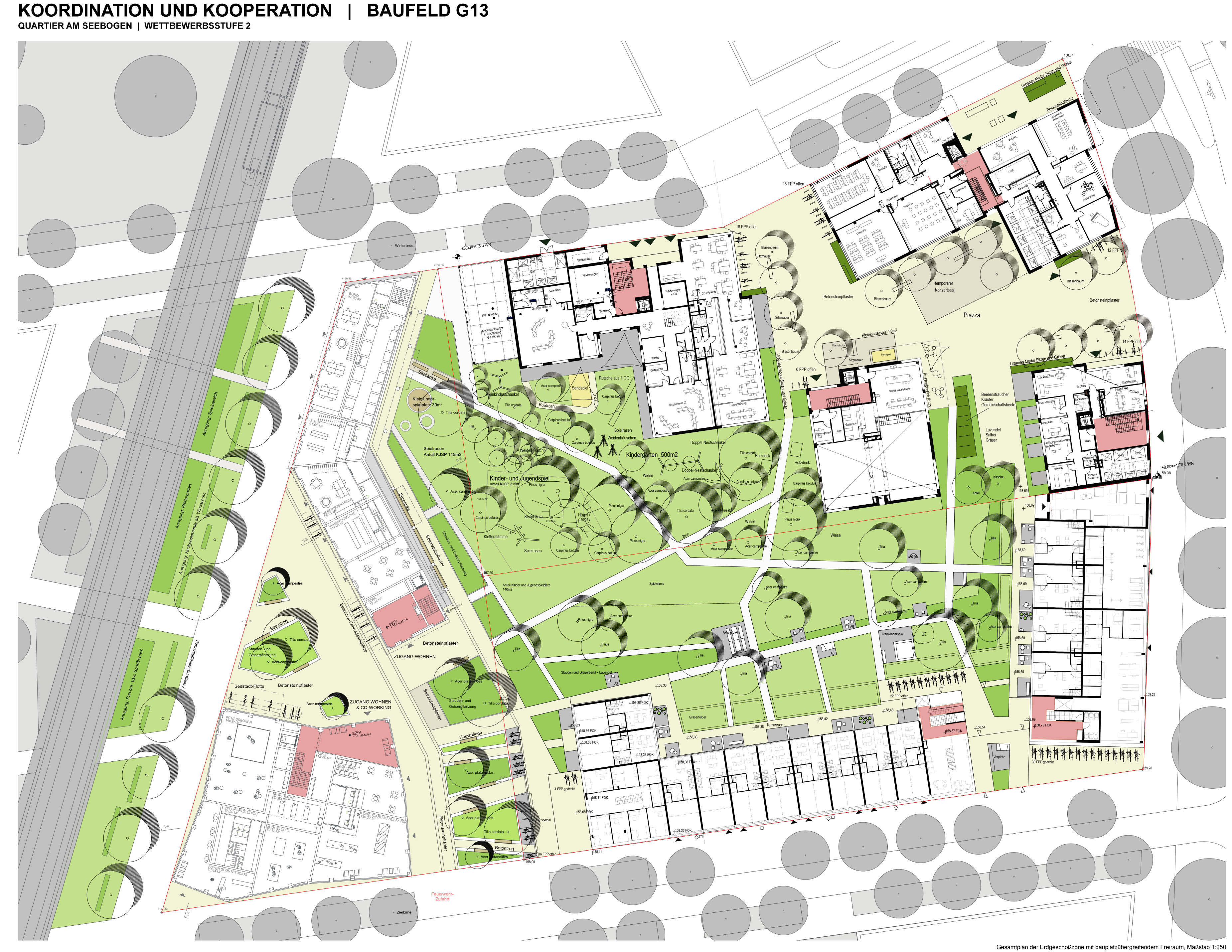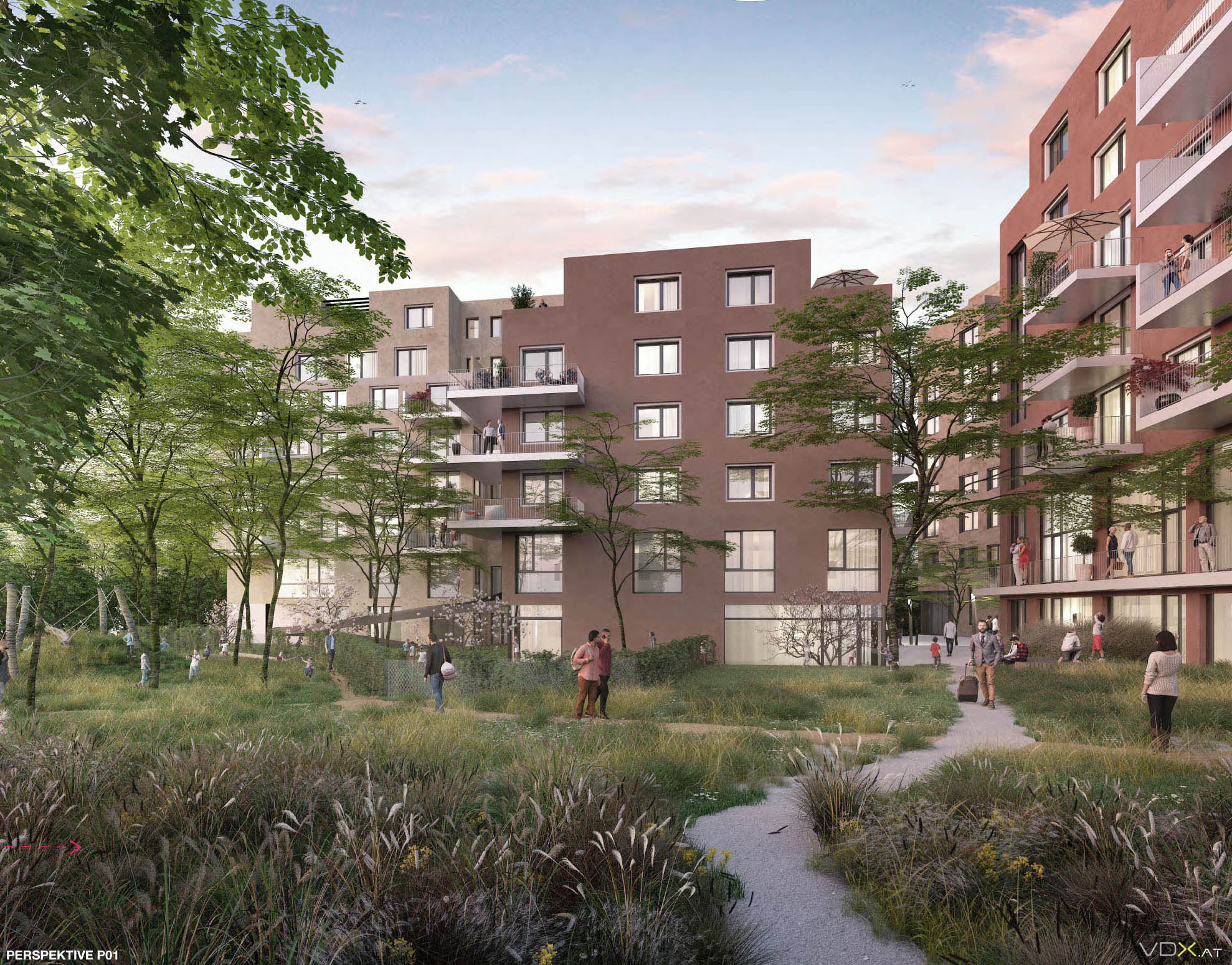 Aufgabe: In diesem parkartigen Freiraum setzen Baumpflanzungen und Staudenbeete starke Grünakzente. Ein bauplatzübergreifender Kinder- und Jugendspielplatz, ein Gemeinschaftsgarten mit Beeten und eine Gemeinschaftsküche mit Gartenterrasse sind Angebote für die BewohnerInnen.