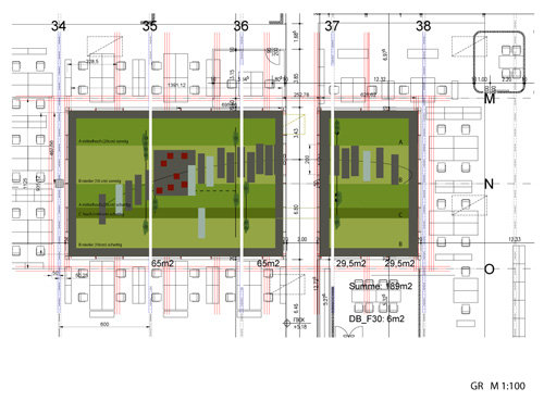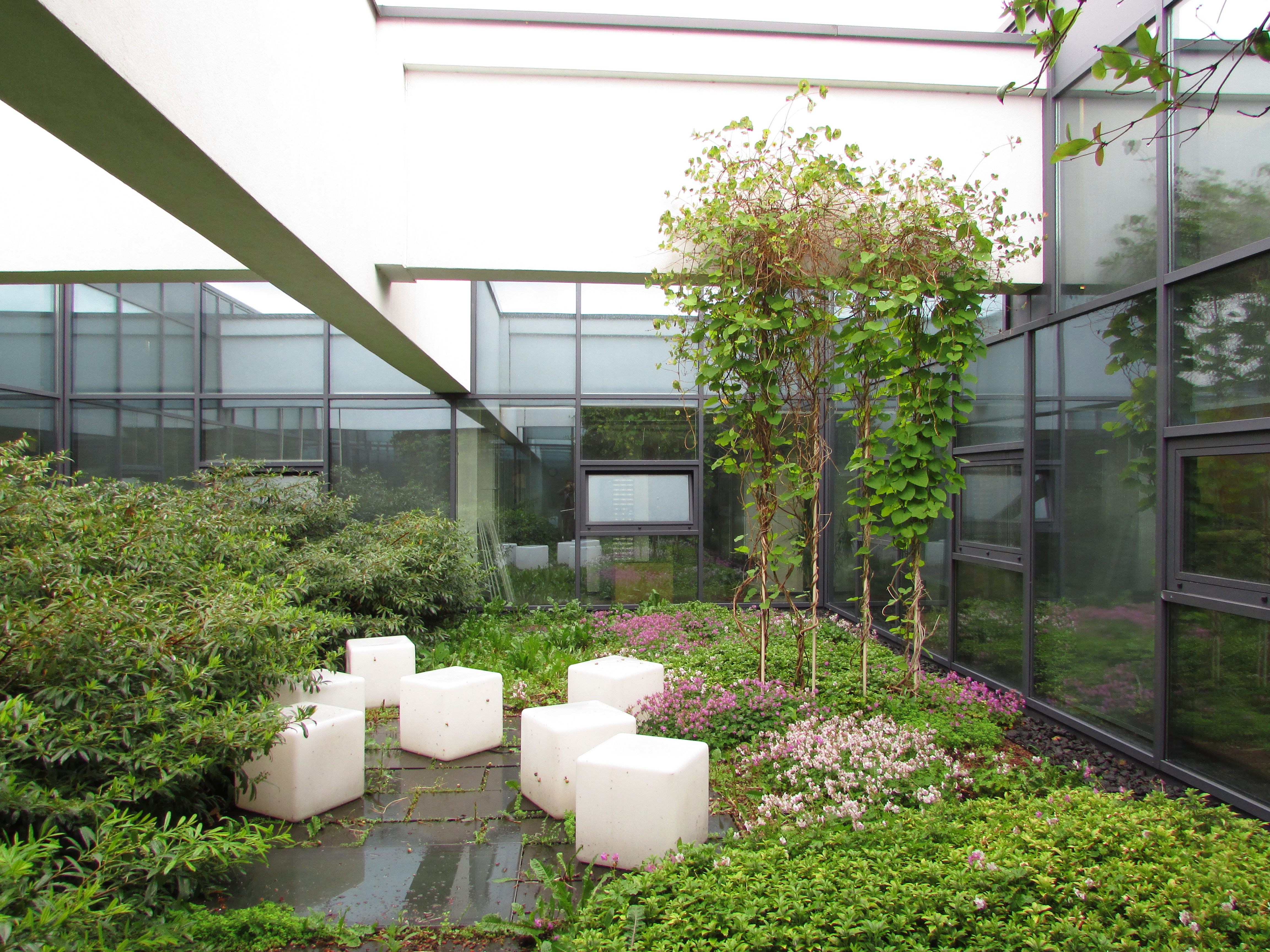 Aufgabe: In einem gewerblichen Büro- und Produktionsbetrieb wird ein zentraler Dachgarten in einem Atrium angelegt. Dieser Ort dient den MitarbeiterInnen als optisch erholsamer und luftiger Raum – ein Pausenraum für ruhige Ausblicke und Frischluft. Die streifenförmige Anordnung der Pflanzen und die optische Fortsetzung durch die Spiegelung in den umgebenden Glaspanelen lassen den Garten größer erscheinen. Die bündigen Dachluken sowie die Sitzelemente schaffen eine stimmige Lichtatmosphäre am Abend.