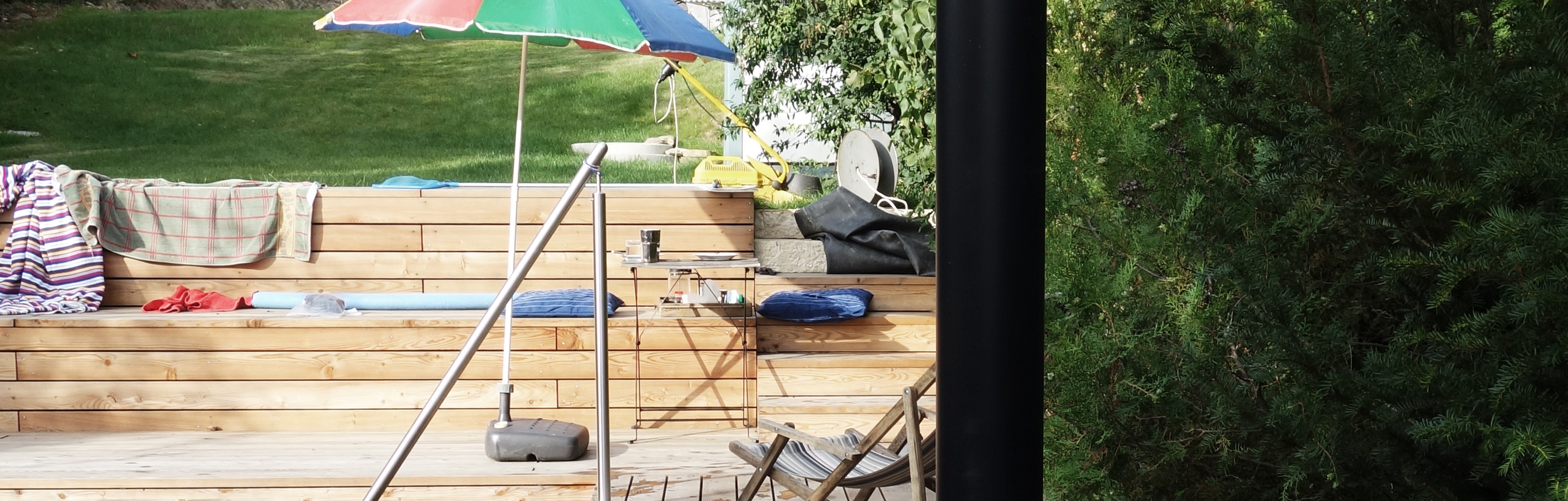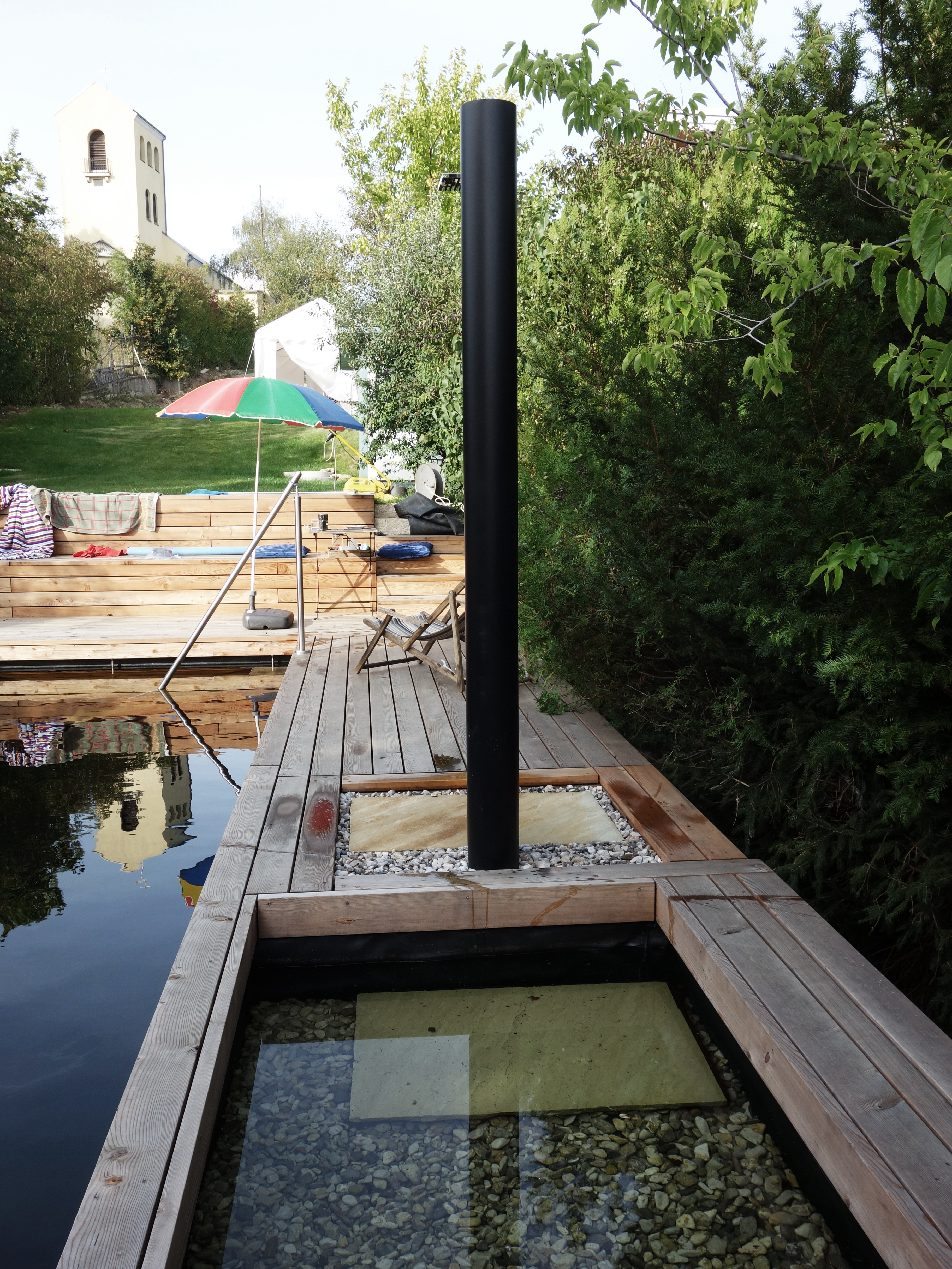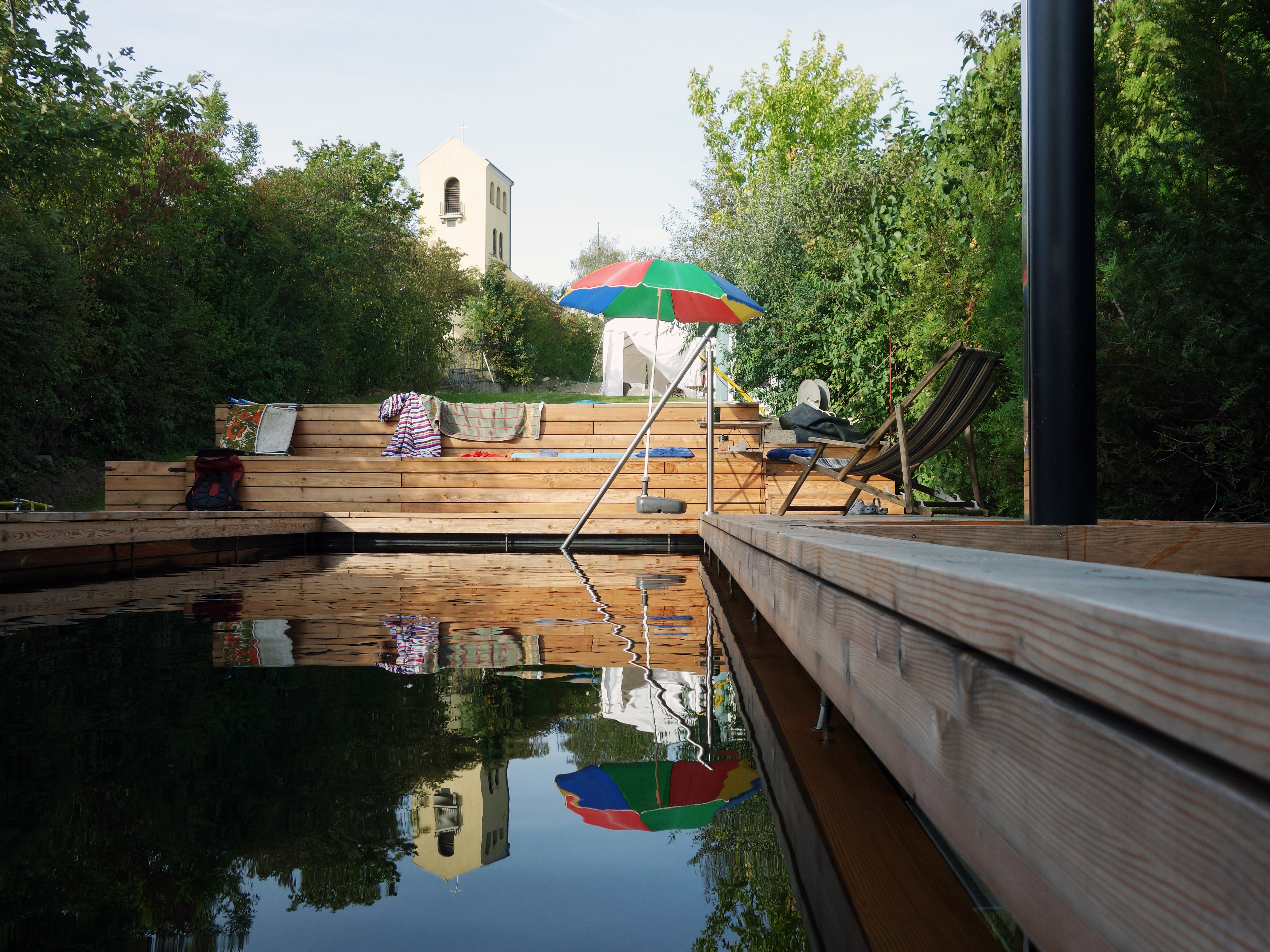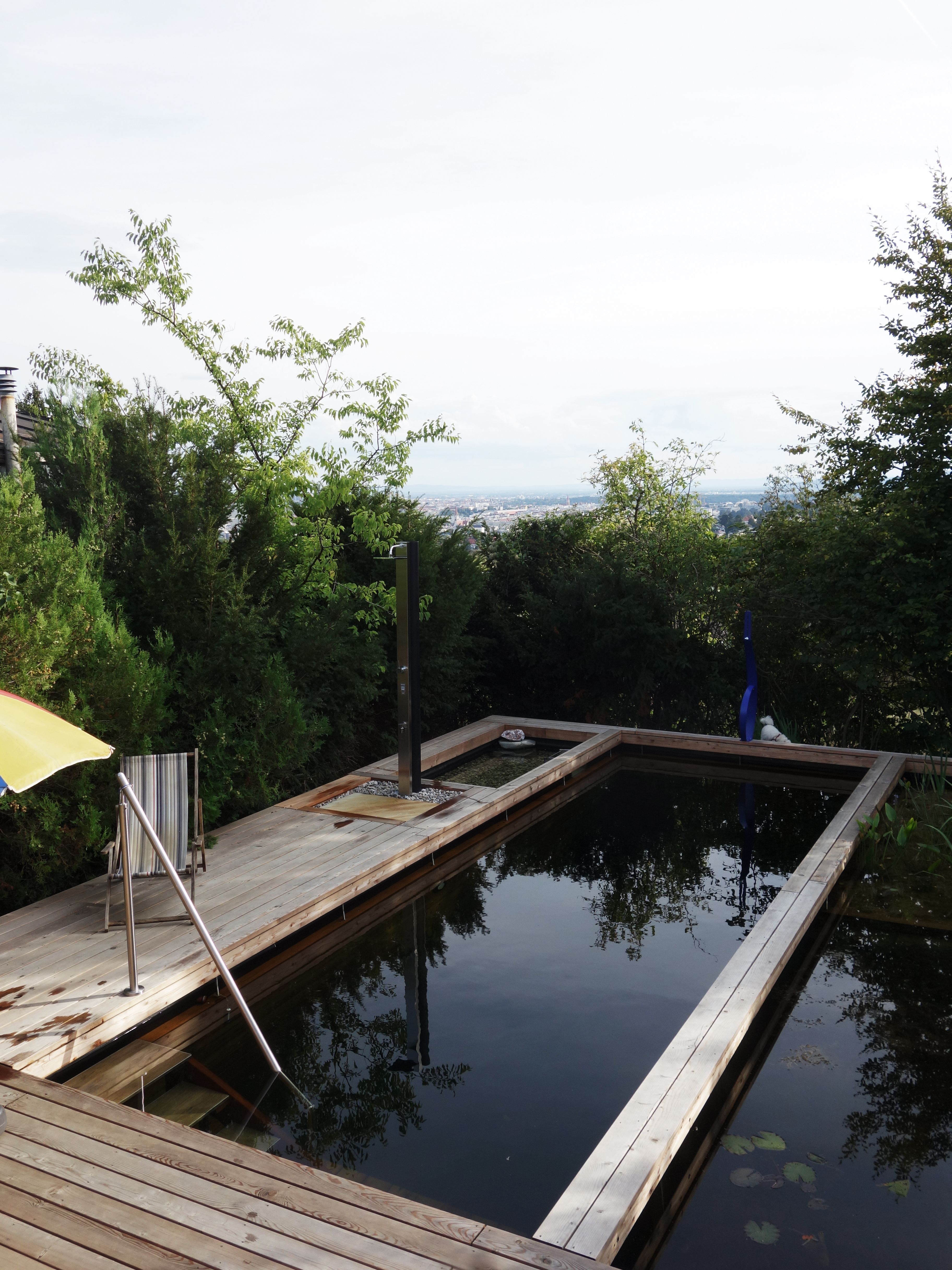Aufgabe: In einem Kleingarten am Schafberg mit südseitiger Ausrichtung wird ein Naturpool geschaffen. Eine kleine Schwimmoase entsteht. Das Pool wird unter Wasser mit Holzbohlen ausgekleidet. Eine Zone mit Wasserpflanzen ist seitlich angeordnet und reinigt das Wasser.