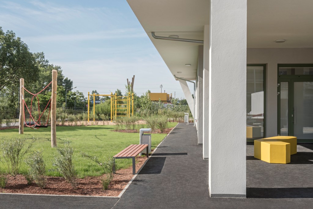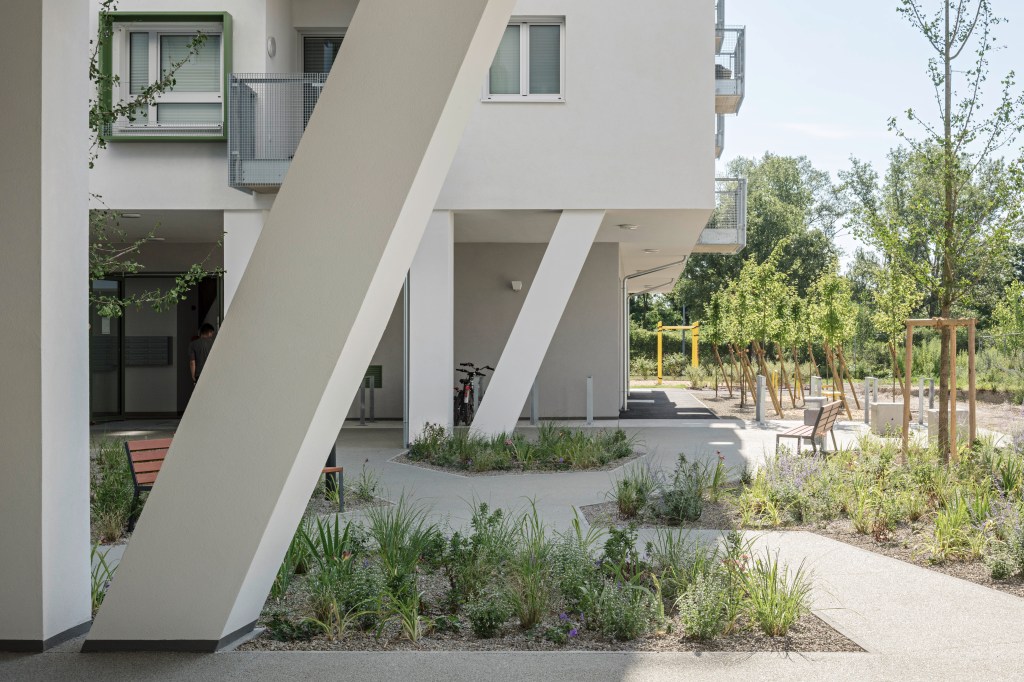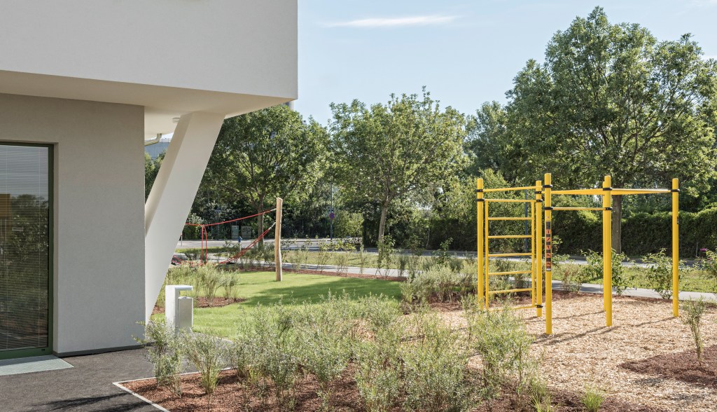 Das Projekt Leonie & Leo, ein geförderter Wohnbau im Stadterweiterungsgebiet Neu-Leopoldau besteht aus zwei Baukörpern (Leonie & Leo). Die Freiräume beziehen sich auf die Architektur und sind für die BewohnerInnen frei zugänglich und nutzbar. Die Aktivitätszonen um das Gebäude sind mit Fitnessgeräten, Spielgeräten, Tischtennistisch und Sitzelementen ausgestattet.