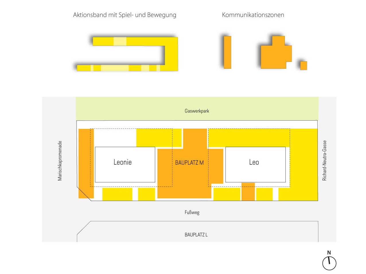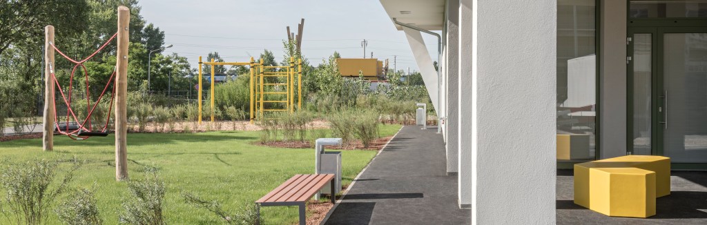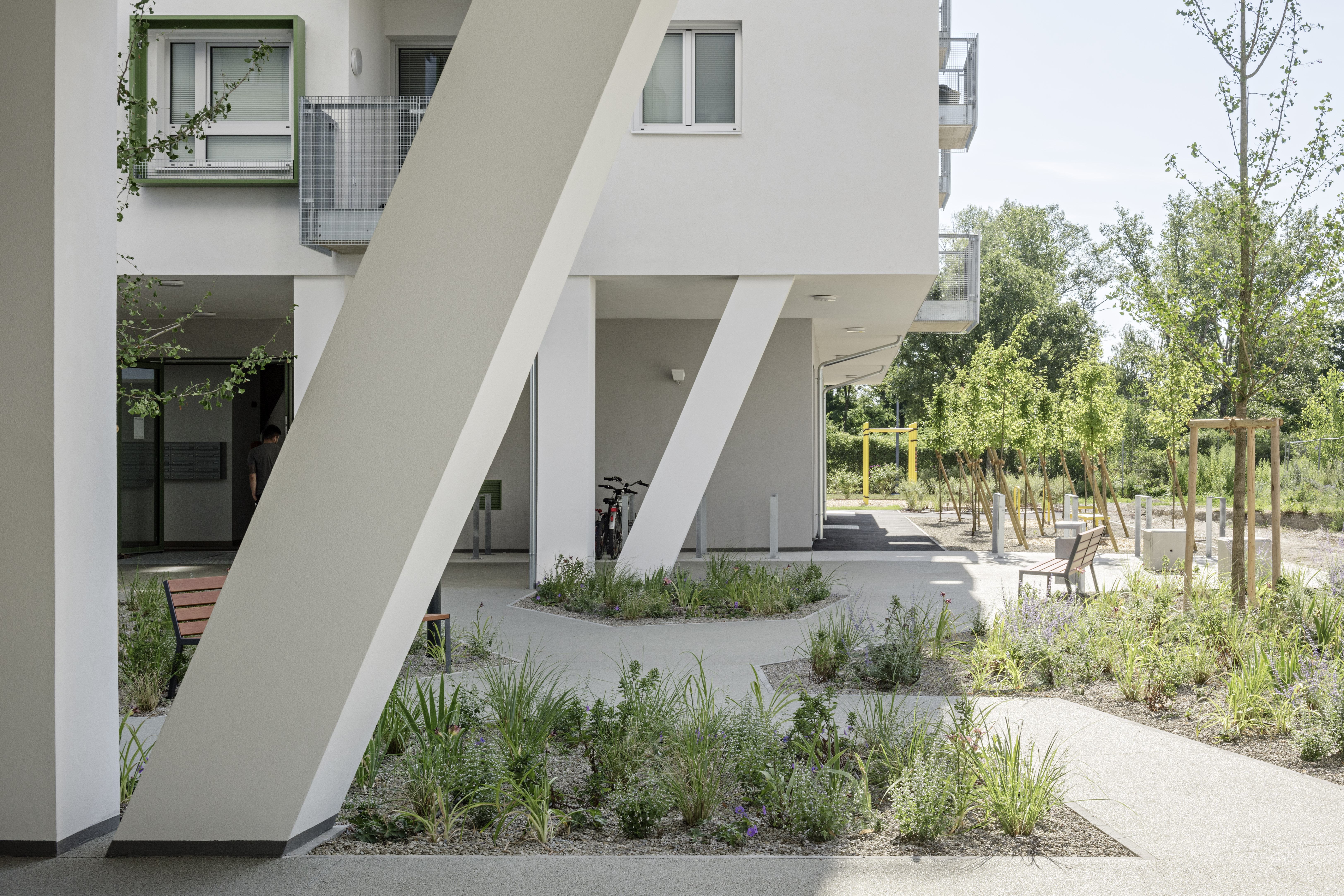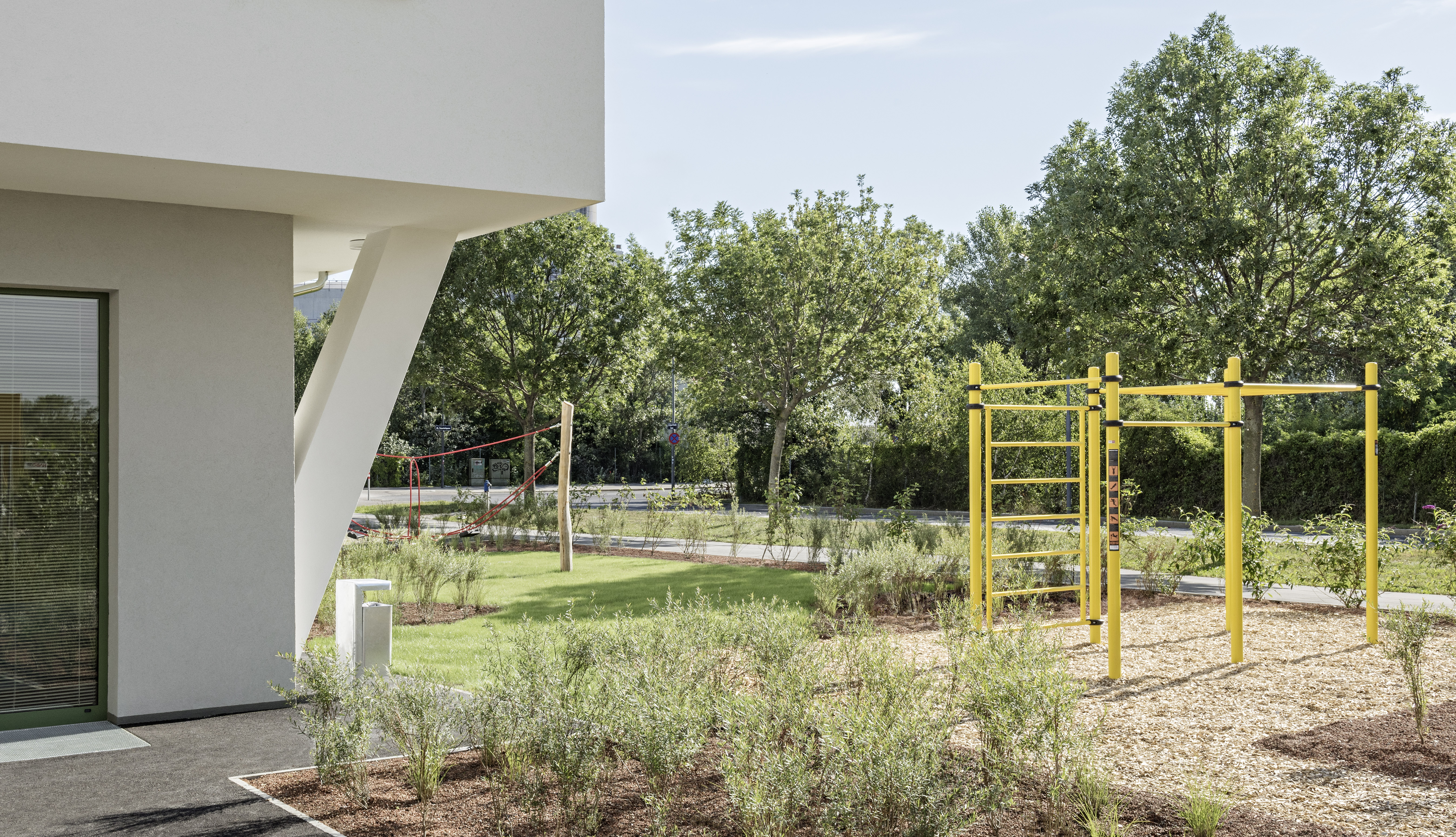 Aufgabe: Das Projekt Leonie & Leo, ein geförderter Wohnbau im Stadterweiterungsgebiet Neu-Leopoldau besteht aus zwei Baukörpern (Leonie & Leo). Die Freiräume beziehen sich auf die Architektur und sind für die BewohnerInnen frei zugänglich und nutzbar. Die Aktivitätszonen um das Gebäude sind mit Fitnessgeräten, Spielgeräten, Tischtennistisch und Sitzelementen ausgestattet.
