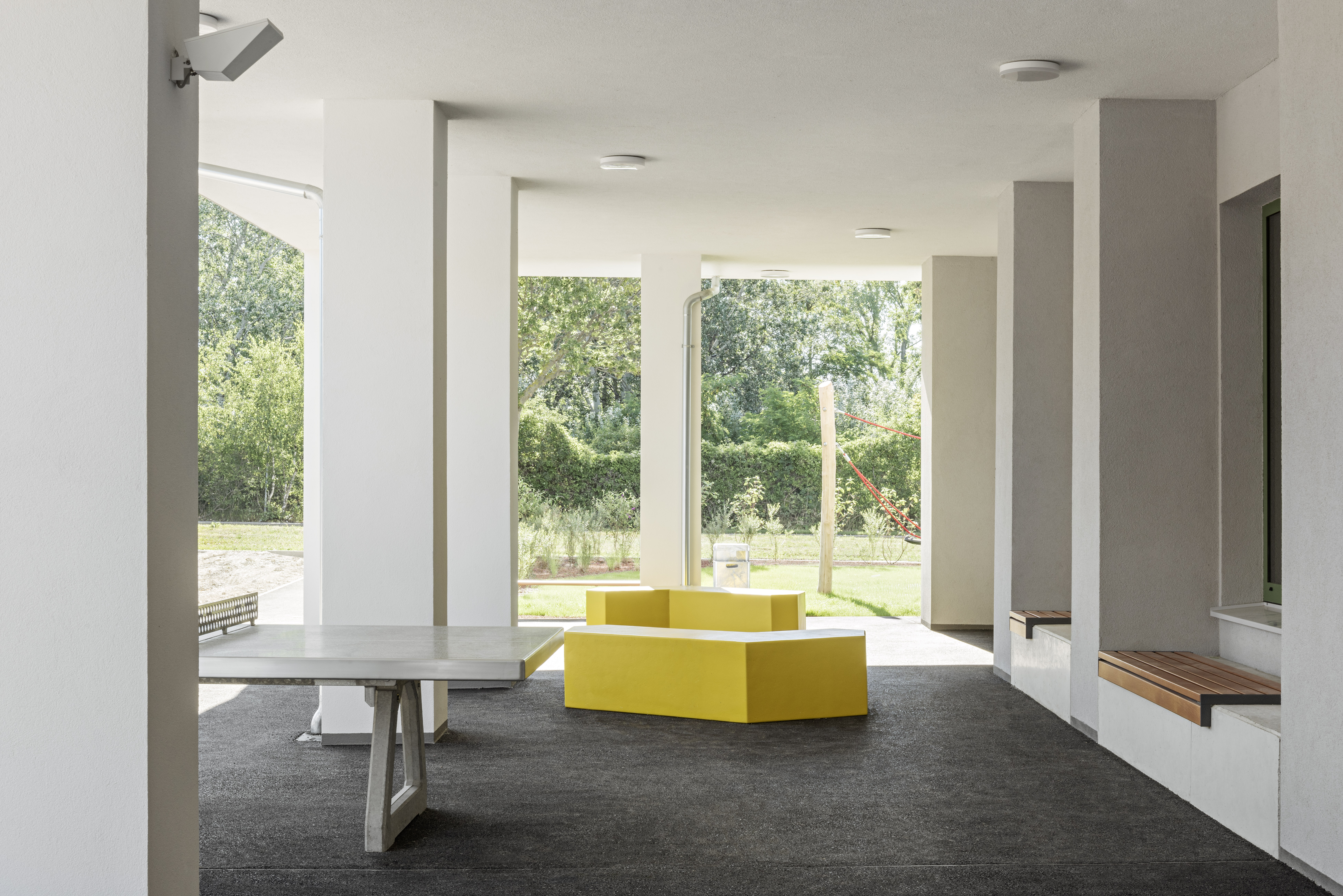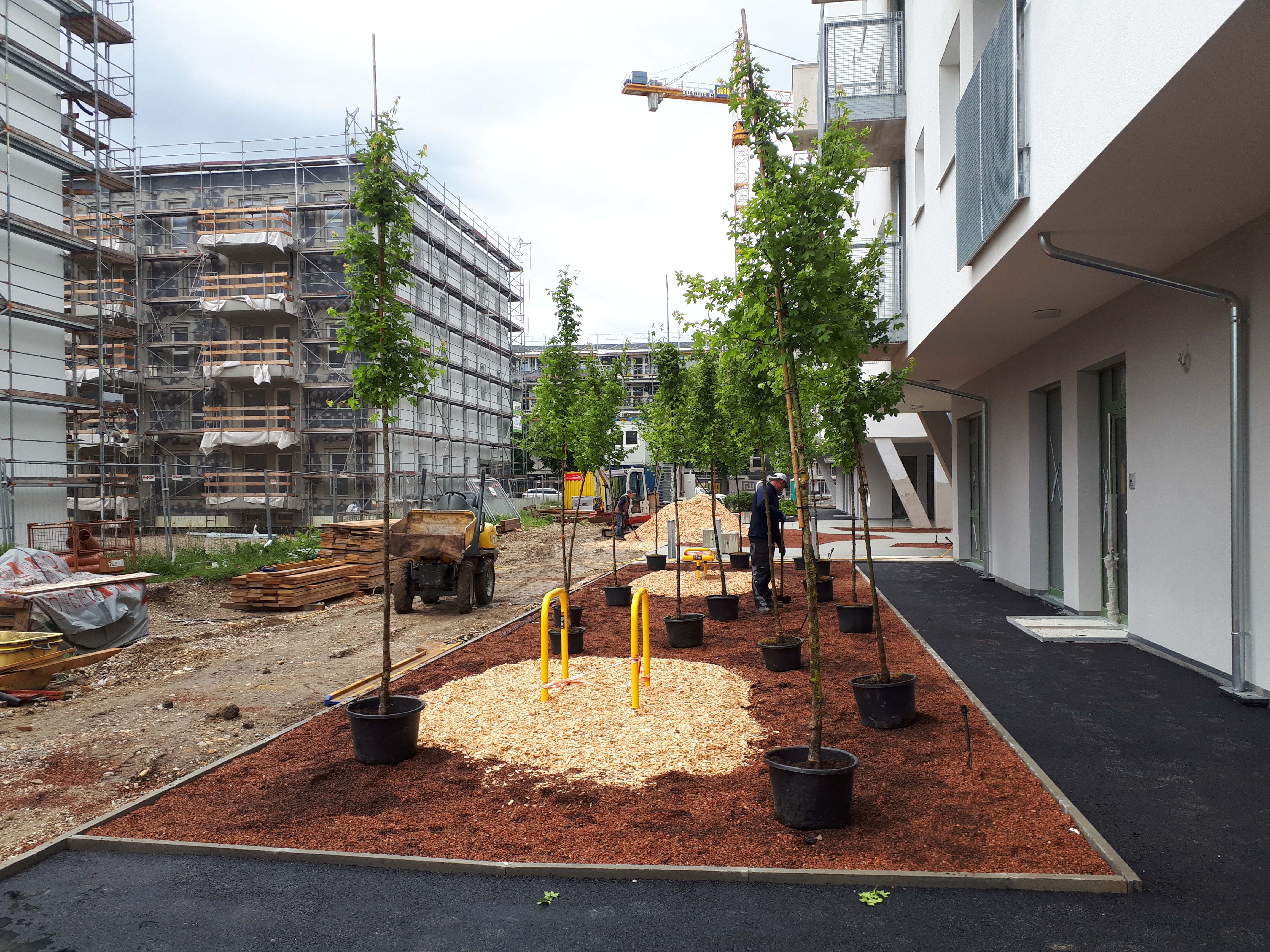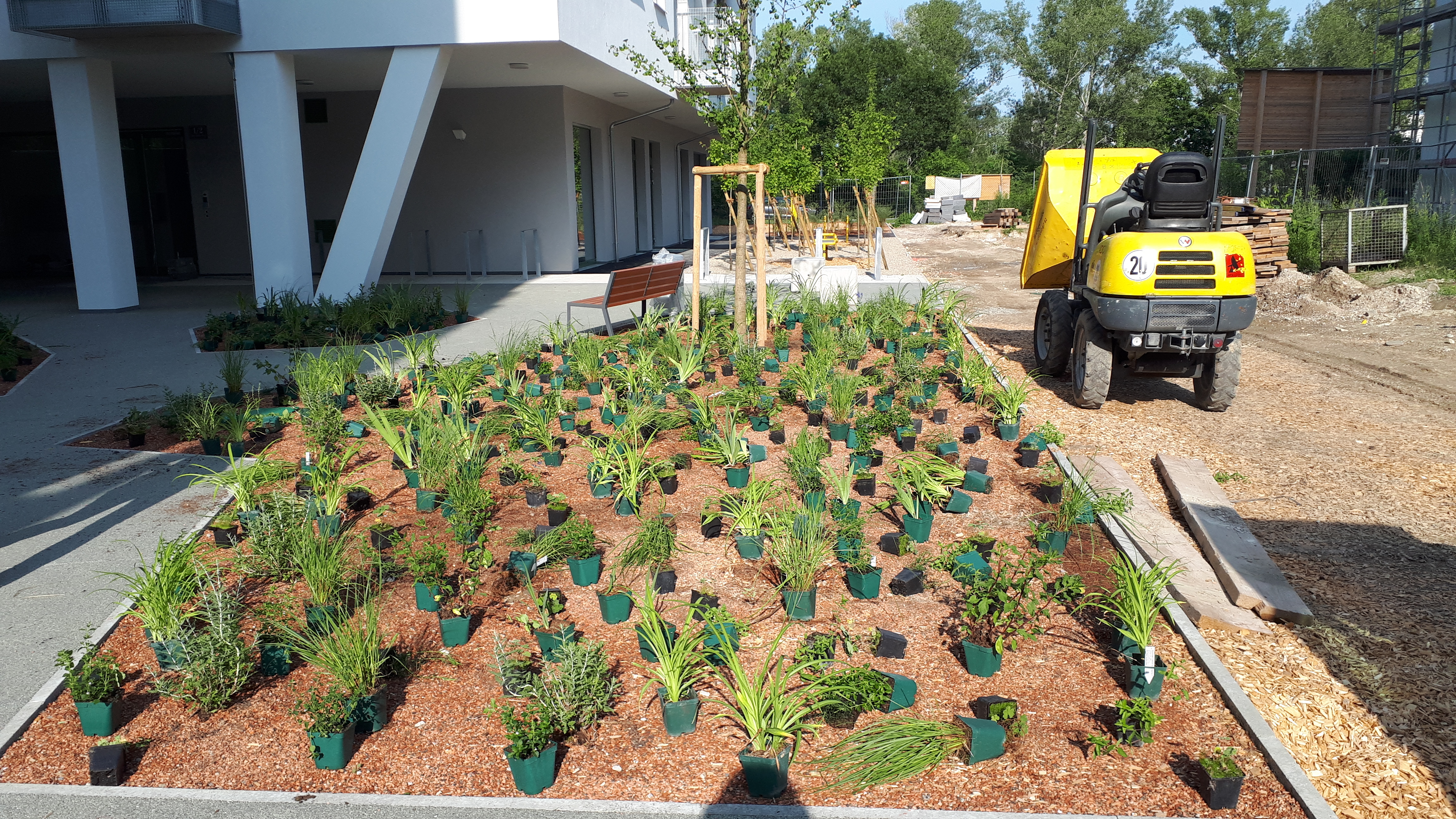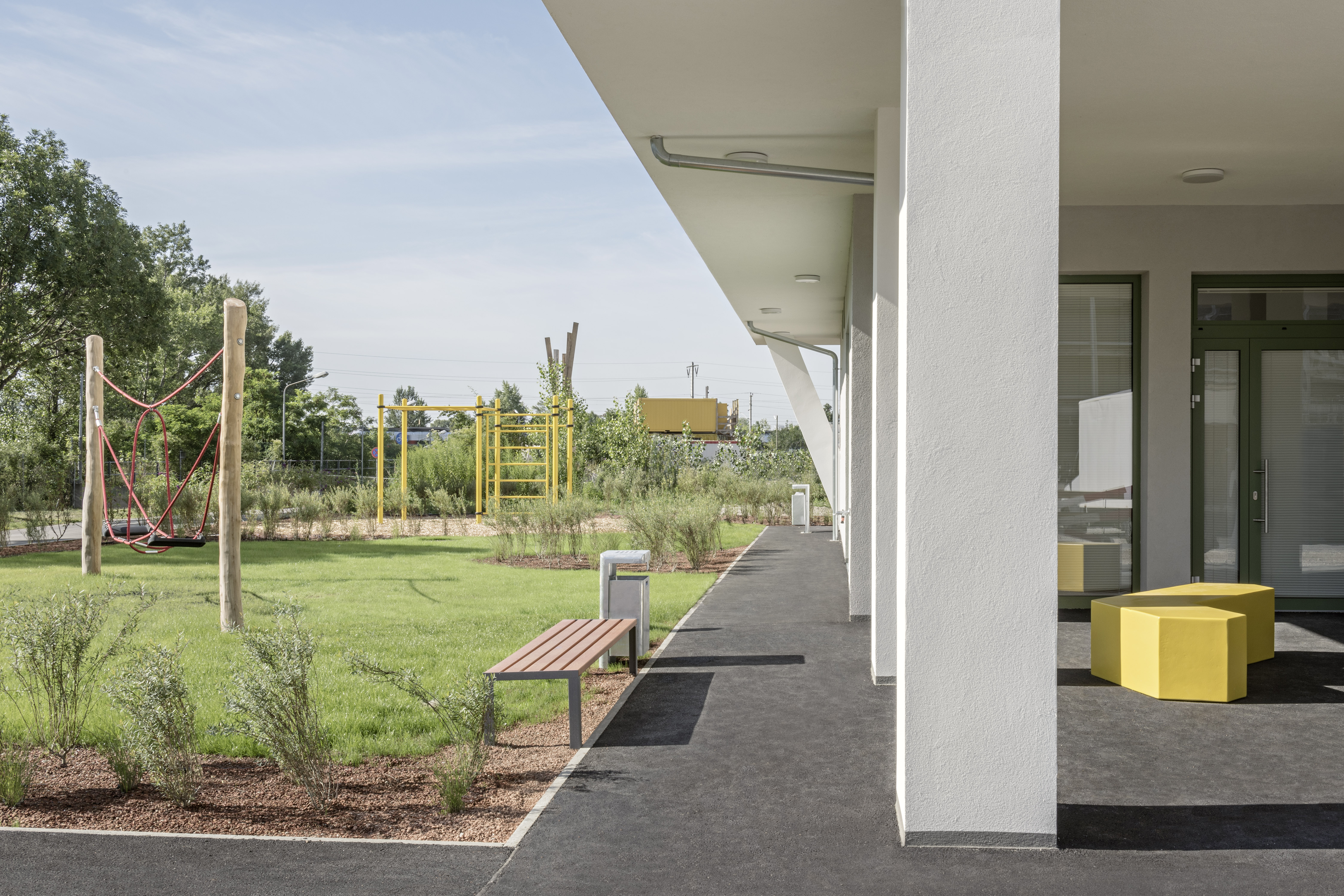Aufgabe: Das Projekt Leonie & Leo, ein geförderter Wohnbau im Stadterweiterungsgebiet Neu-Leopoldau besteht aus zwei Baukörpern (Leonie & Leo). Die Freiräume beziehen sich auf die Architektur und sind für die BewohnerInnen frei zugänglich und nutzbar. Die Aktivitätszonen um das Gebäude sind mit Fitnessgeräten, Spielgeräten, Tischtennistisch und Sitzelementen ausgestattet.