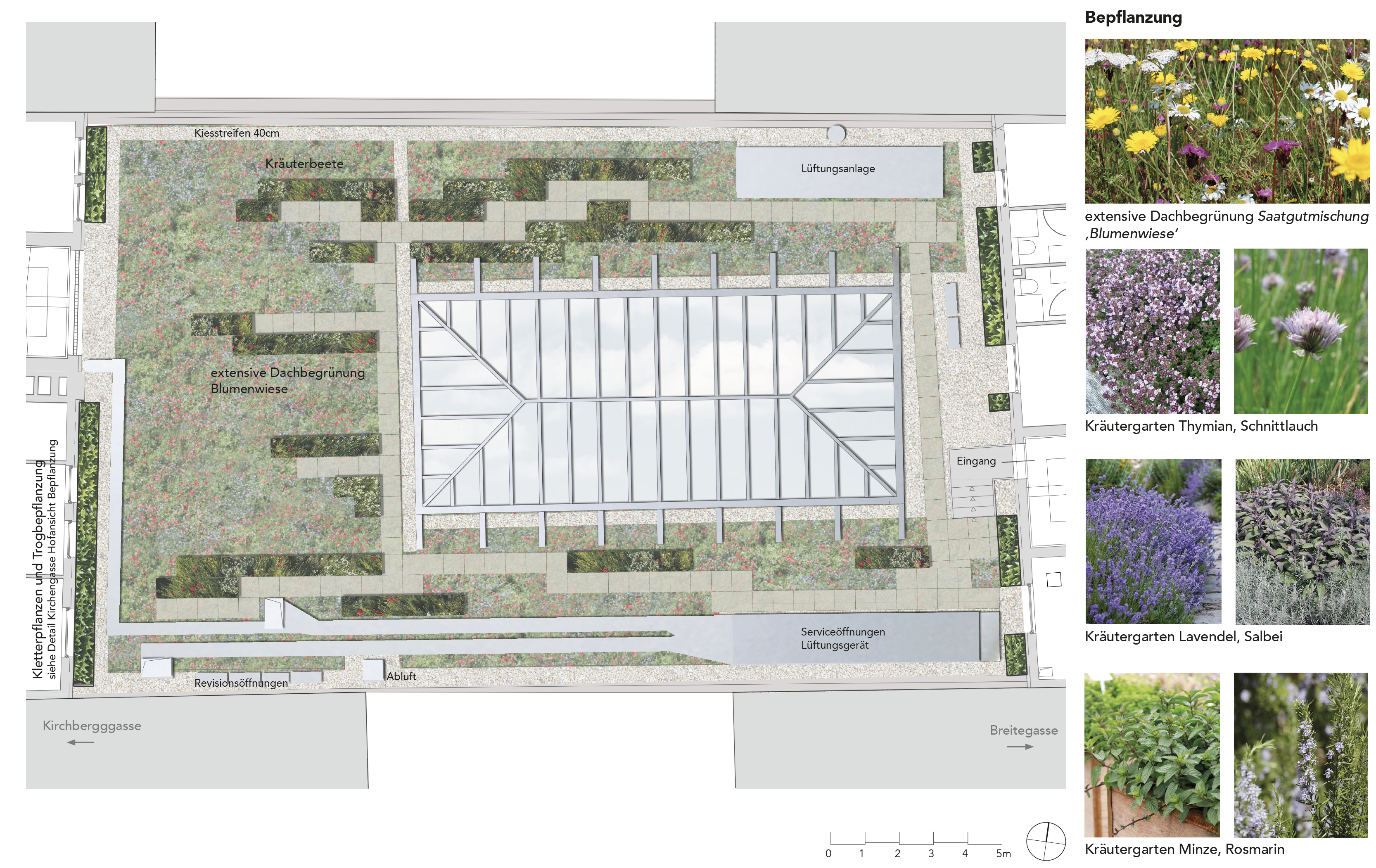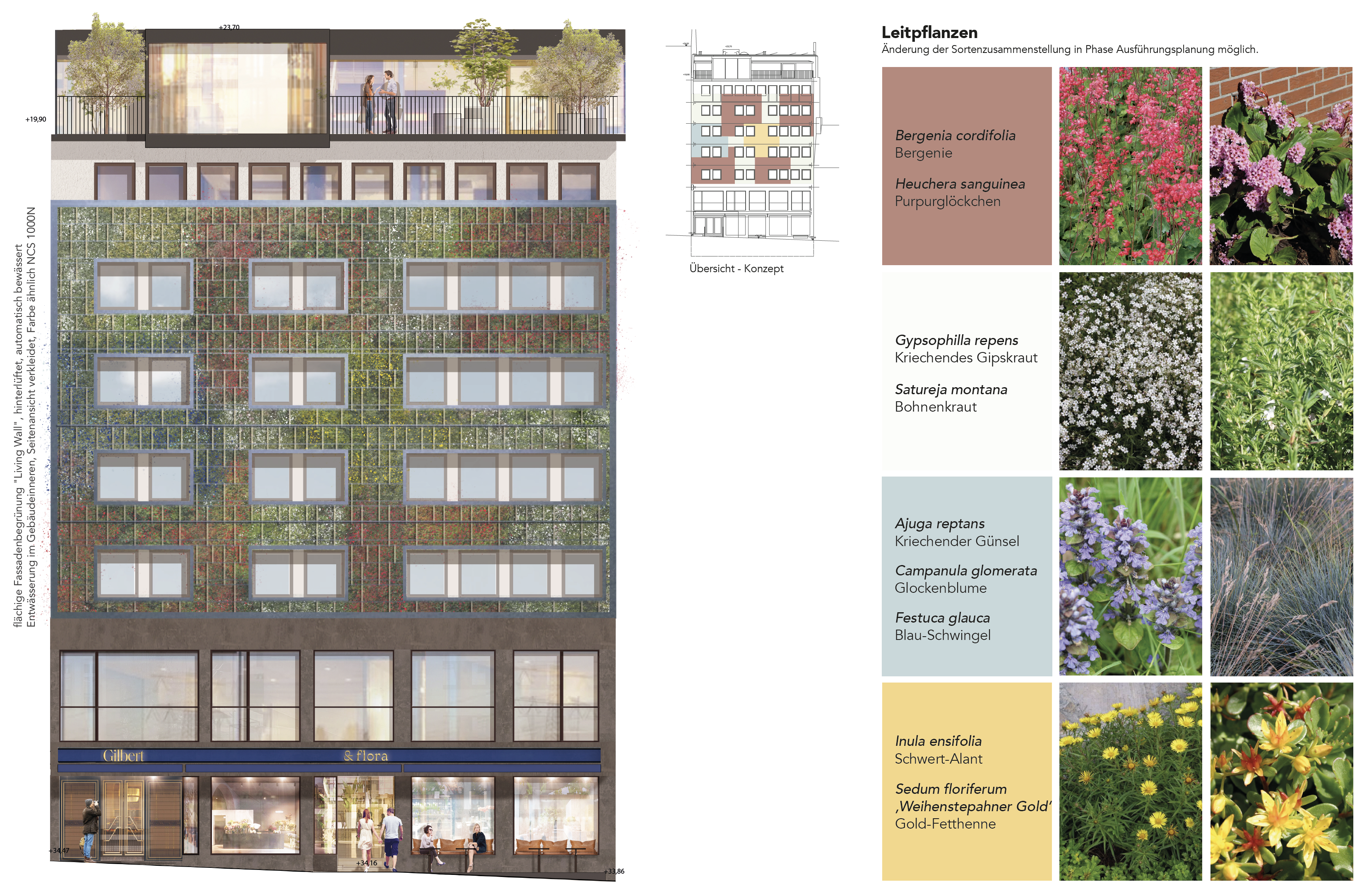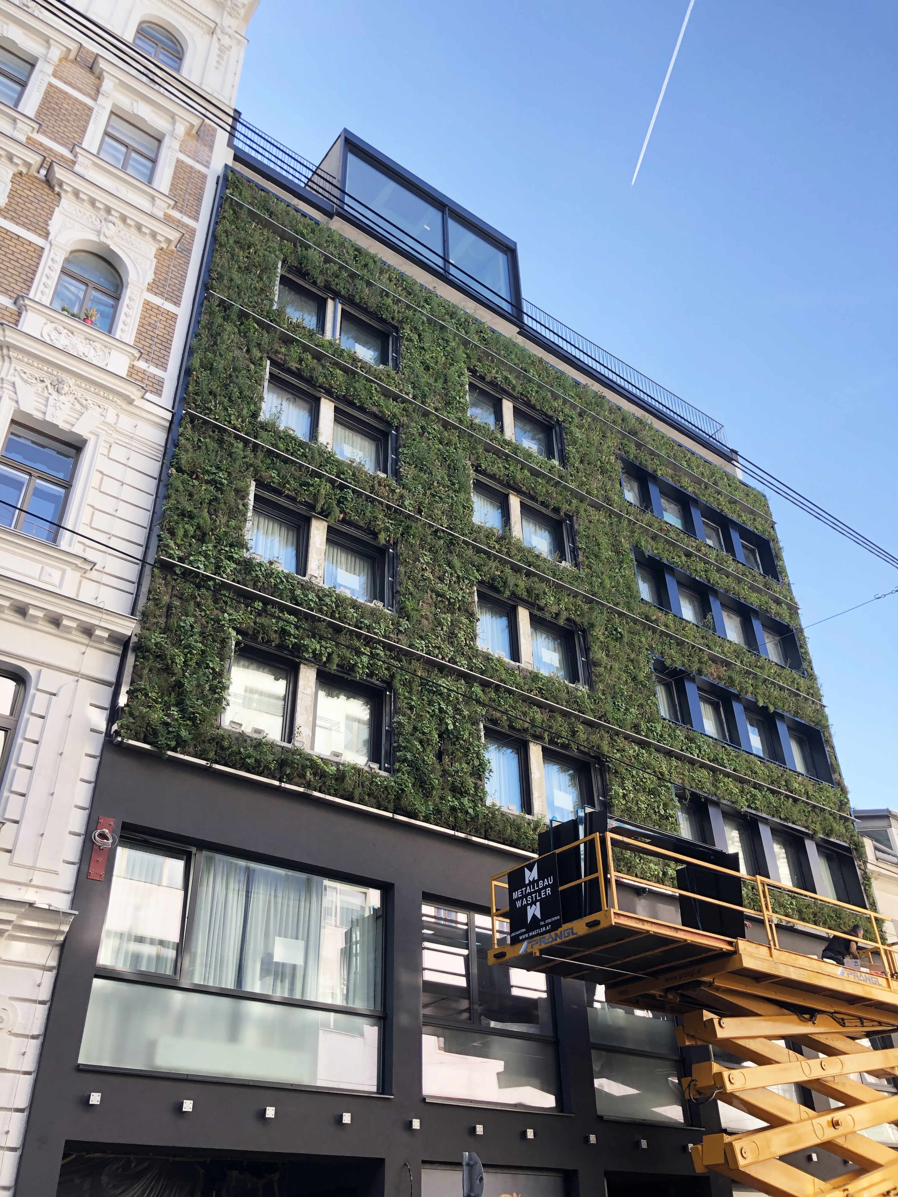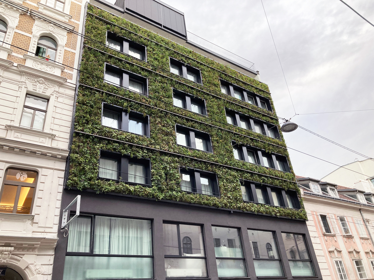 Aufgabe: Für das Hotelprojekt im 7. Wiener Gemeindebezirk werden Begrünungslösungen entwickelt. Vertikalbegrünungen an den beiden Straßenfassaden sowie im Innenhof sorgen für ein angenehmes Klima und einen grünen Anblick. Im Innenhof bringt eine extensive Dachbegrünung mit einer Blumenwiese und einem Kräutergarten frisches Grün in das Hotel.