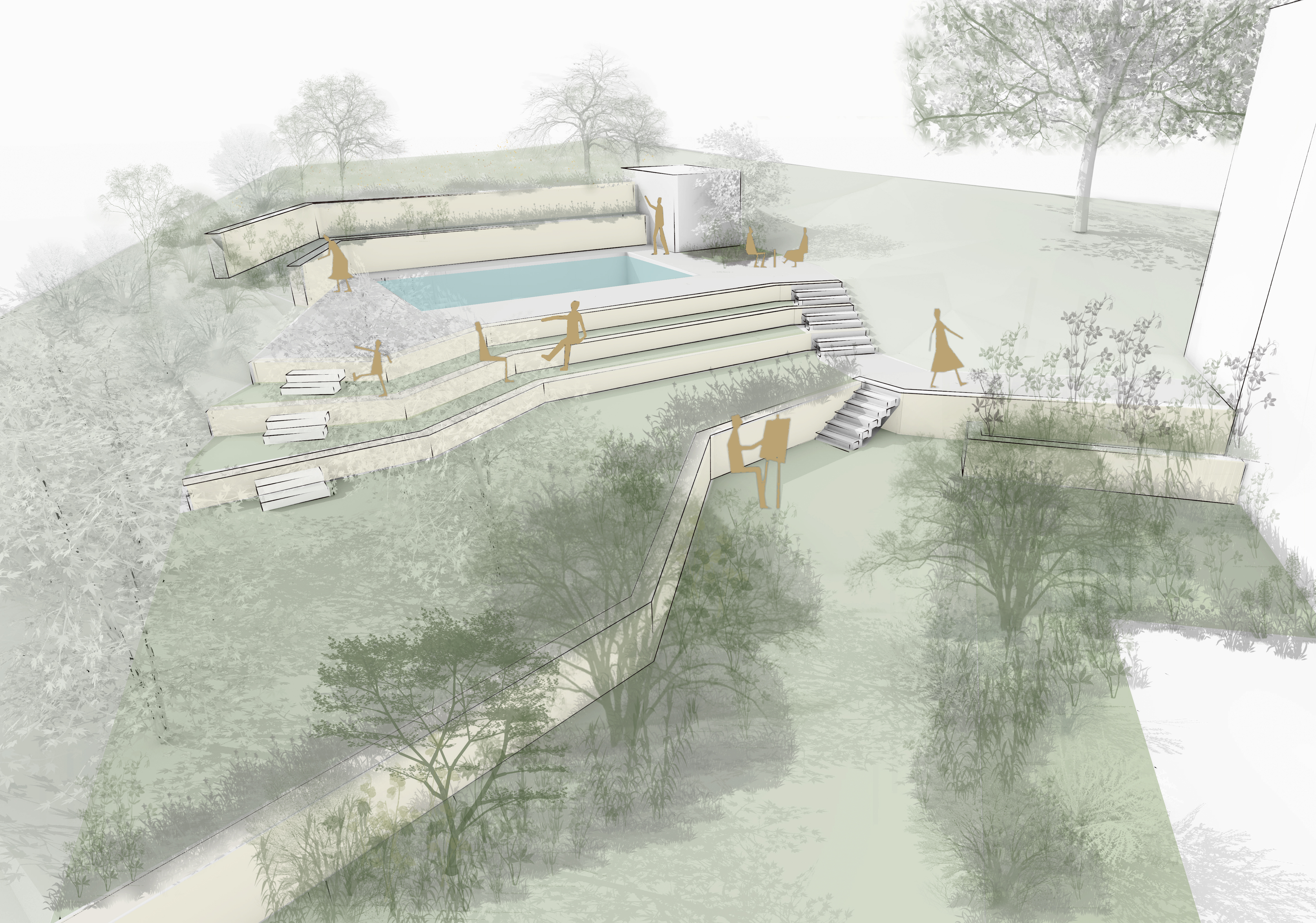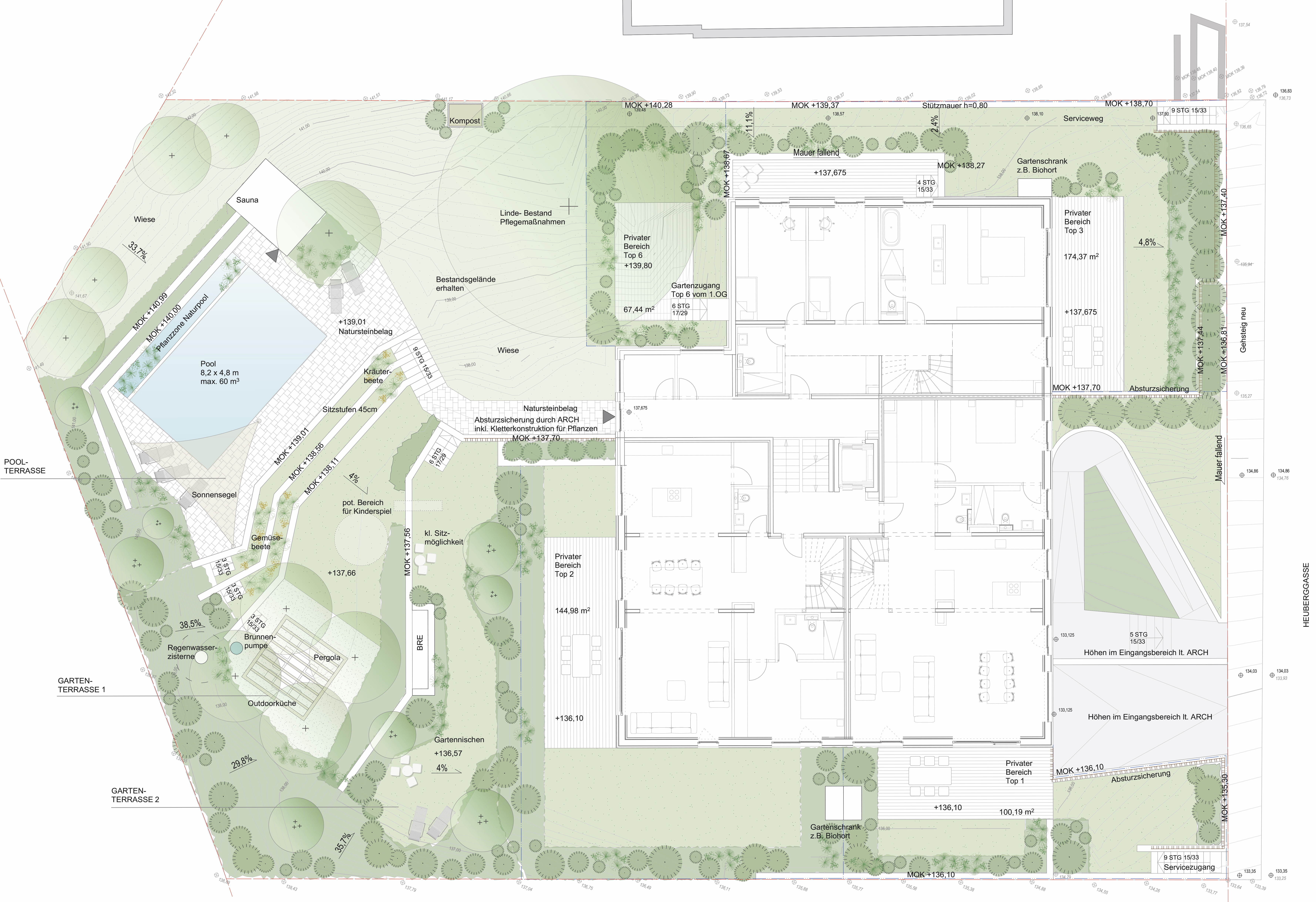 Aufgabe: Der Garten eines Mehrparteienhauses auf einem Hanggrundstück in Dornbach wird terrassiert und zu benutzbaren Gemeinschaftsflächen sowie Eigengärten ausgestaltet. Es gibt unterschiedliche Sitzbereiche, einen Naturpool, eine Sauna sowie eine abwechslungsreiche Bepflanzung.