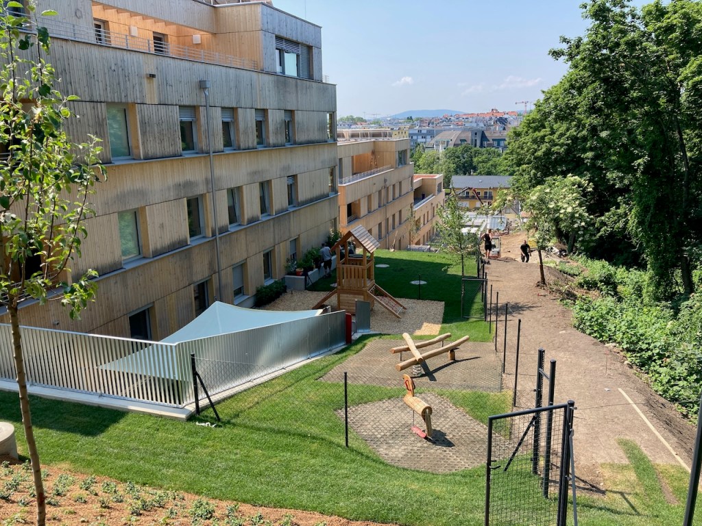 Der Bauplatz zeichnet sich durch seine geschützte Lage am Hang aus, wobei die einzelnen Wohnbauten nach oben getreppt sind. Die Landschaft fängt die Hanglage über Böschungen und Stützmauern ein. Die Erschließung erfolgt über eine Treppenanlage. Der Kleinkinderspielplatz ist dem Gemeinschaftsraum zugeordnet und wird zum Treffpunkt der Anlage.