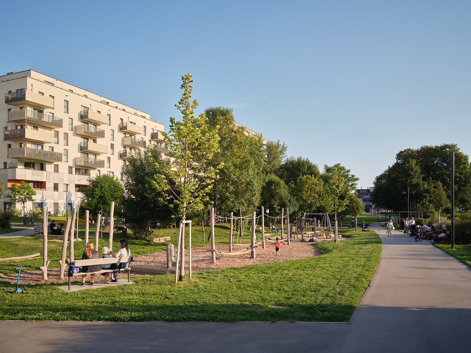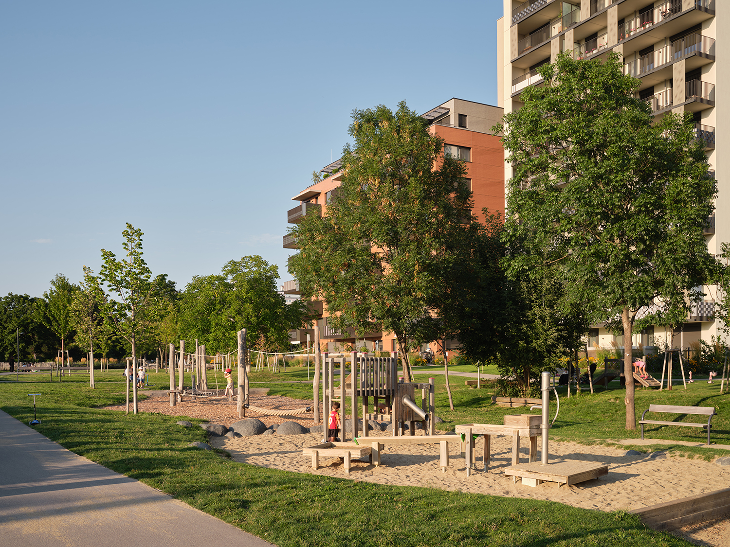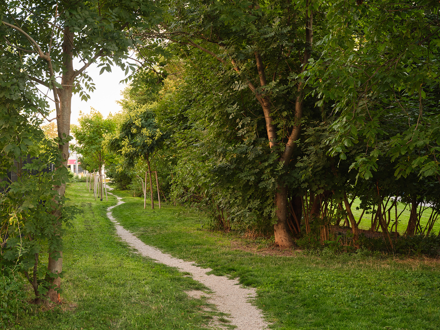 Der Park erstreckt sich entlang des neuen Entwicklungsgebietes ‚Leben am langen Felde‘ auf den ehemaligen Gründen der Firma Hrachowina und stellt ein zusätzliches Freiraumangebot für die Bewohner:innen und die Nachbarschaft dar. Der ursprüngliche Charakter des Ortes wird durch die Bestandsbäume erhalten. Aufenthalts-, Spiel- und Sportangebote sowie eine Hundezone stehen zur Nutzung bereit.