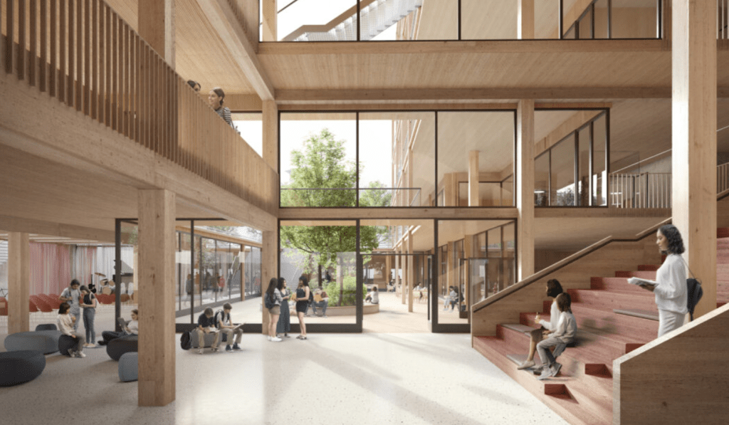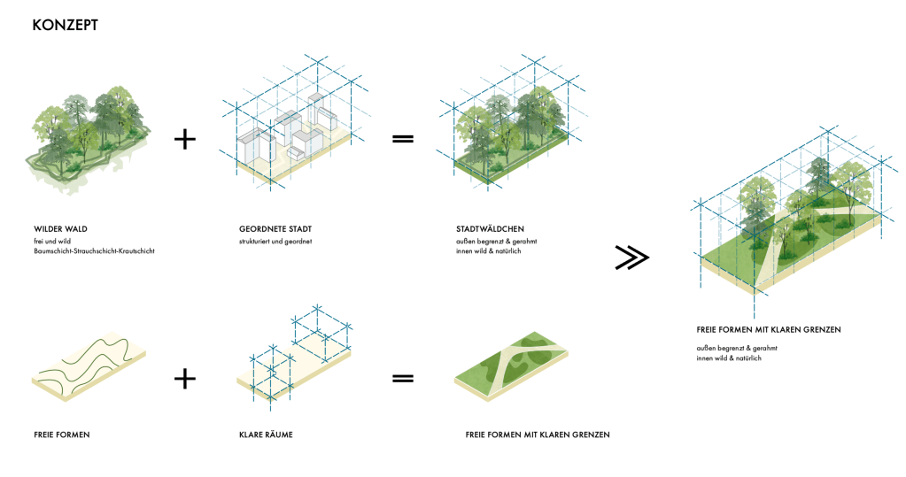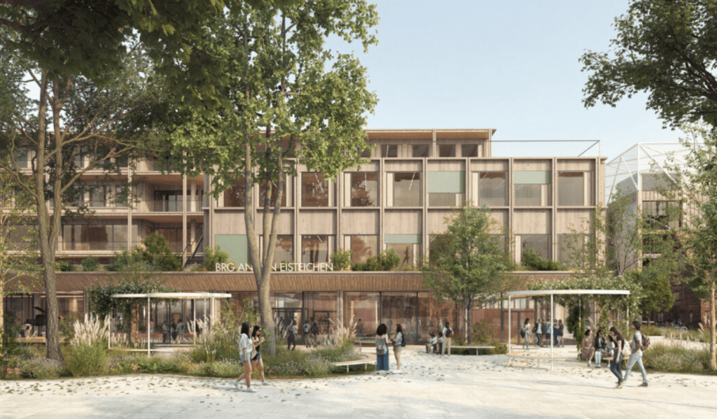 Das Schulbauprojekt fügt sich harmonisch in das historische Ortsbild Altmannsdorfs. Eine Höhenstaffelung und verbundene Terrassen schaffen maßstäbliche Freiräume. Die Außenanlagen umfassen sowohl öffentliche als auch exklusive Bereiche, darunter ein Schulvorplatz, ein Innenhof und Schulgarten, sowie intensiv begrünte Terrassen auf mehreren Geschossen, die das Mikroklima verbessern. Im Bauteil Ost finden sich Sportflächen, die von begrünten Aufenthaltsbereichen umrahmt werden. Bei den Baumneupflanzungen wird auf Vielfalt wertgelegt. Daraus entstehen eine hohe Diversität sowie eine gute Resilienz gegen Ausfälle. Pergolen und Sonnensegel dienen zusätzlich als Sonnenschutz. Ziel der Gestaltung ist eine hohe Nutzbarkeit der Schulfreiräume kombiniert mit einer intensiven Durchgrünung auf allen Ebenen.