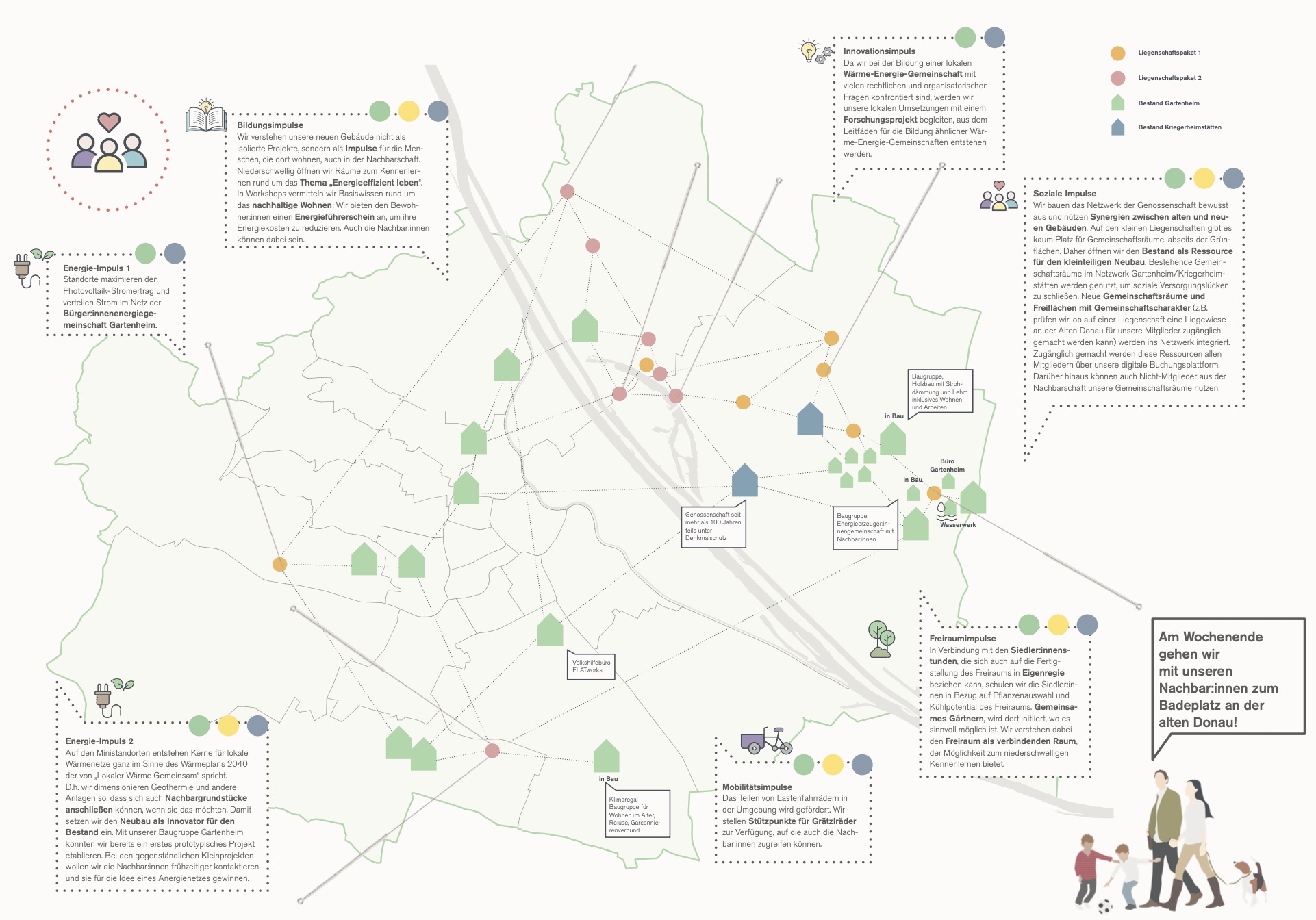 Auf neun Grundstücken in Floridsdorf, der Donaustadt und in Favoriten werden geförderte Wohnbauten errichtet. Trotz der geringen Größe der einzelnen Liegenschaften gehen von jedem Projekt Impulse für die Nachbarschaft aus und aktivieren alte und neue Siedler:innen und Nachbarschaften. Ein Pocketpark, kommunikative Eingangszonen, gemeinschaftliche Freiräume sowie Wärme-Energie-Gemeinschaften sind Beispiele für die Angebote.
