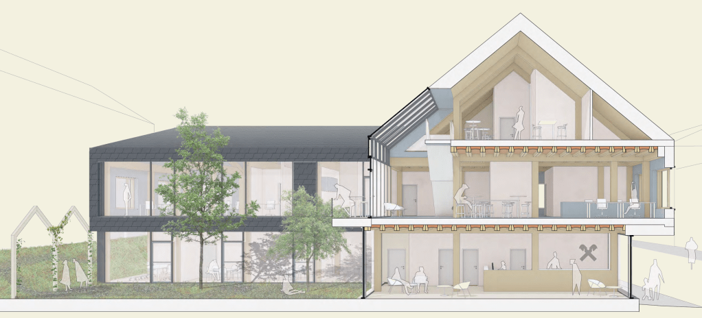 1. Preis. Der Freiraum des neuen Kompetenzzentrums fügt sich harmonisch in den kleinstädtischen Kontext von Lilienfeld ein und vermittelt zwischen Siedlungsraum und umgebender Landschaft. Vorplatz, Veranstaltungsbereich, Garten, Aufenthaltszonen und ein grüner Innenhof gliedern das Grundstück in klar definierte Freiräume mit hoher Aufenthaltsqualität. Ein geschwungener Wildwiesen-Saum mit klimaresilienten Baumneupflanzungen stärkt die Biodiversität und rahmt das Areal. Der offene Vorplatz erweitert den Eingangsbereich und schafft mit Baumpflanzungen, Sitzmöglichkeiten und Radstellplätzen einen einladenden Ort. Der durch modulare Stahlbögen gefasste Veranstaltungsbereich ermöglicht flexible Nutzungen für unterschiedliche Veranstaltungen und Anlässe. Garten und Innenhof bieten geschützte und schattige Bereiche für Gespräche mit Kund:innen und fördern zugleich ein angenehmes Mikroklima. Ein Rundweg verbindet alle Zonen zu einem zusammenhängenden, lebendigen Freiraum.
